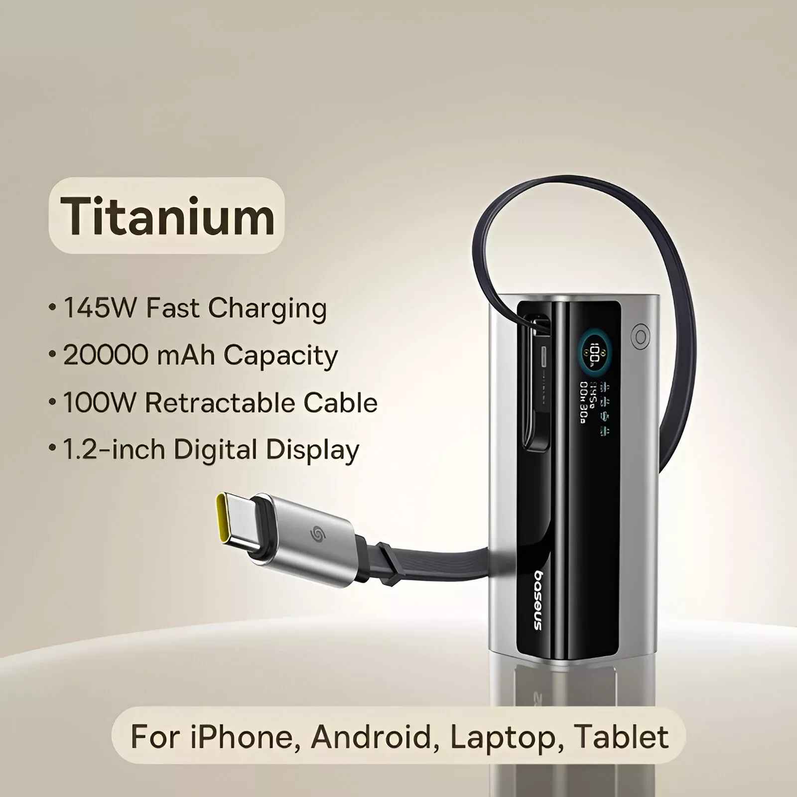 The standout feature is the built-in 100W retractable USB-C cable. No more tangled cords or forgotten cables. Just pull, charge, and go. With support for advanced fast-charging protocols, it intelligently delivers the right amount of power to phones, tablets, laptops, gaming consoles, cameras, and more. A full-color digital display shows real-time battery status and power output, so you are always in control.