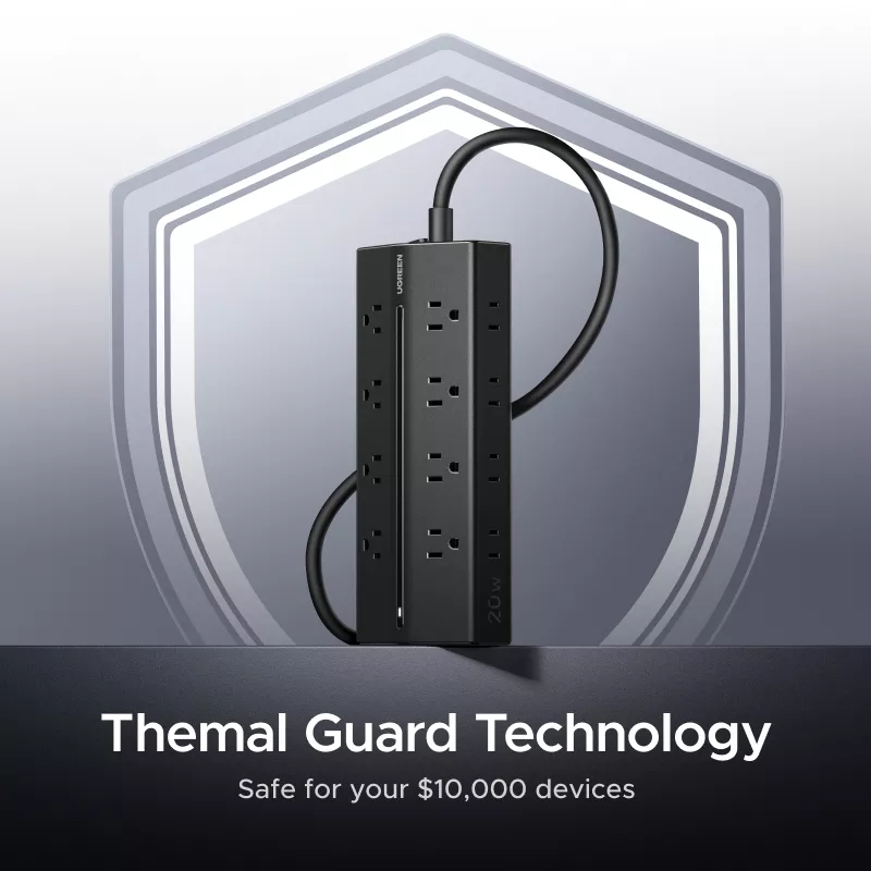Enjoy blazing speed with 20W fast charging—no extra adapter needed. It charges phones and tablets up to three times faster than standard chargers. With built-in overload protection, UL94 V-0 flame-retardant housing, and advanced thermal control, this power strip keeps even high-end electronics protected during continuous use. A sturdy one-button master switch gives you effortless control while preventing accidental shut-offs.