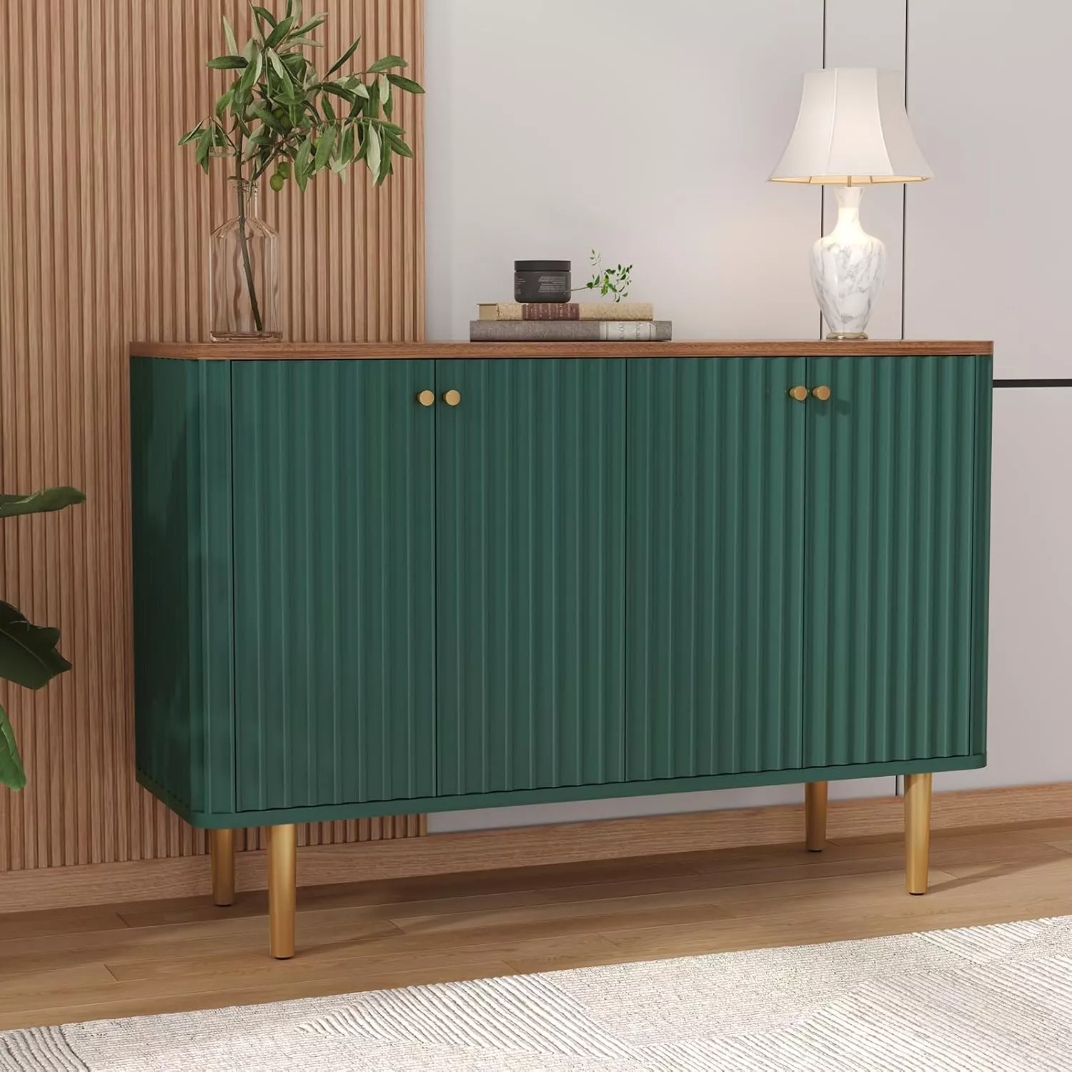 Transform your space with the elegant charm and smart functionality of this 48″ Modern Sideboard Buffet Cabinet. Featuring a bold gold-green color palette and a sleek water ripple design, this 4-door accent cabinet is the perfect blend of modern aesthetics and practical storage. Whether you’re decorating your living room, entryway, dining area, or office, this versatile piece brings a refined touch that elevates any room.