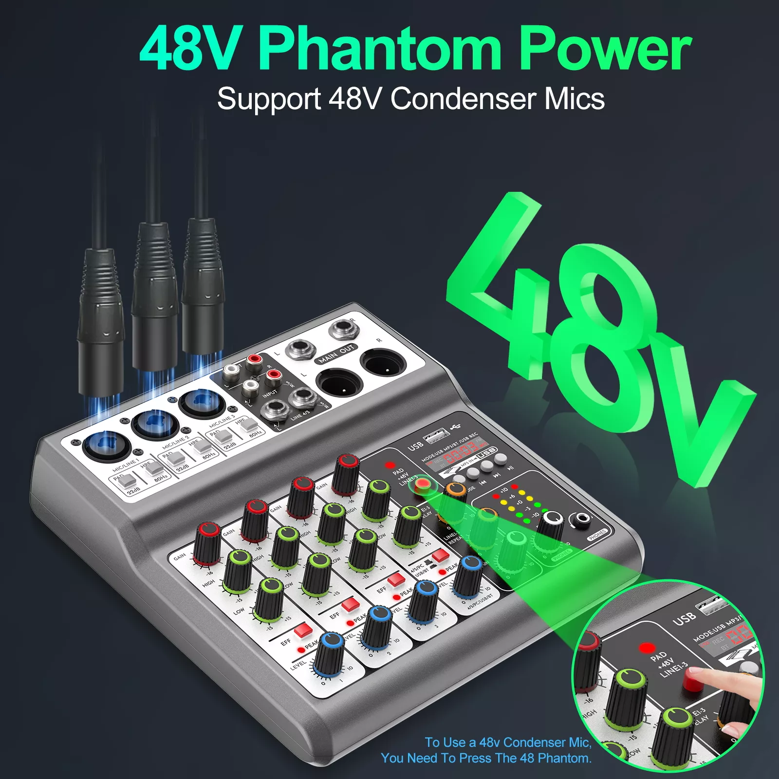 What makes this mixer special is how much control it gives you in such a compact form. Three XLR inputs support condenser microphones with switchable 48V phantom power, while stereo line inputs handle keyboards, media players, and computers. Built-in echo and delay effects add depth and warmth, helping your voice and music sound polished and professional.