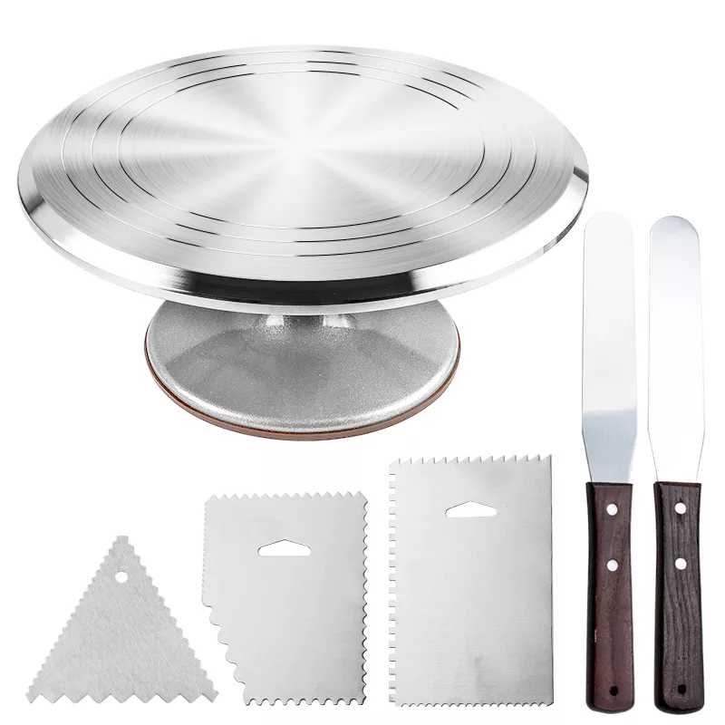 The rotating cake turntable stand is made from heavy-duty aluminum alloy for exceptional stability. Its non-slip surface and silicone base keep your cake steady while you work—no more slipping or sliding as you smooth and decorate. The set also includes both stainless steel and plastic scrapers for maximum versatility and precision. With 12 creative edge patterns, you can effortlessly design textured finishes and professional-looking borders. The included 6-inch spatula helps you spread frosting evenly and decorate with ease.