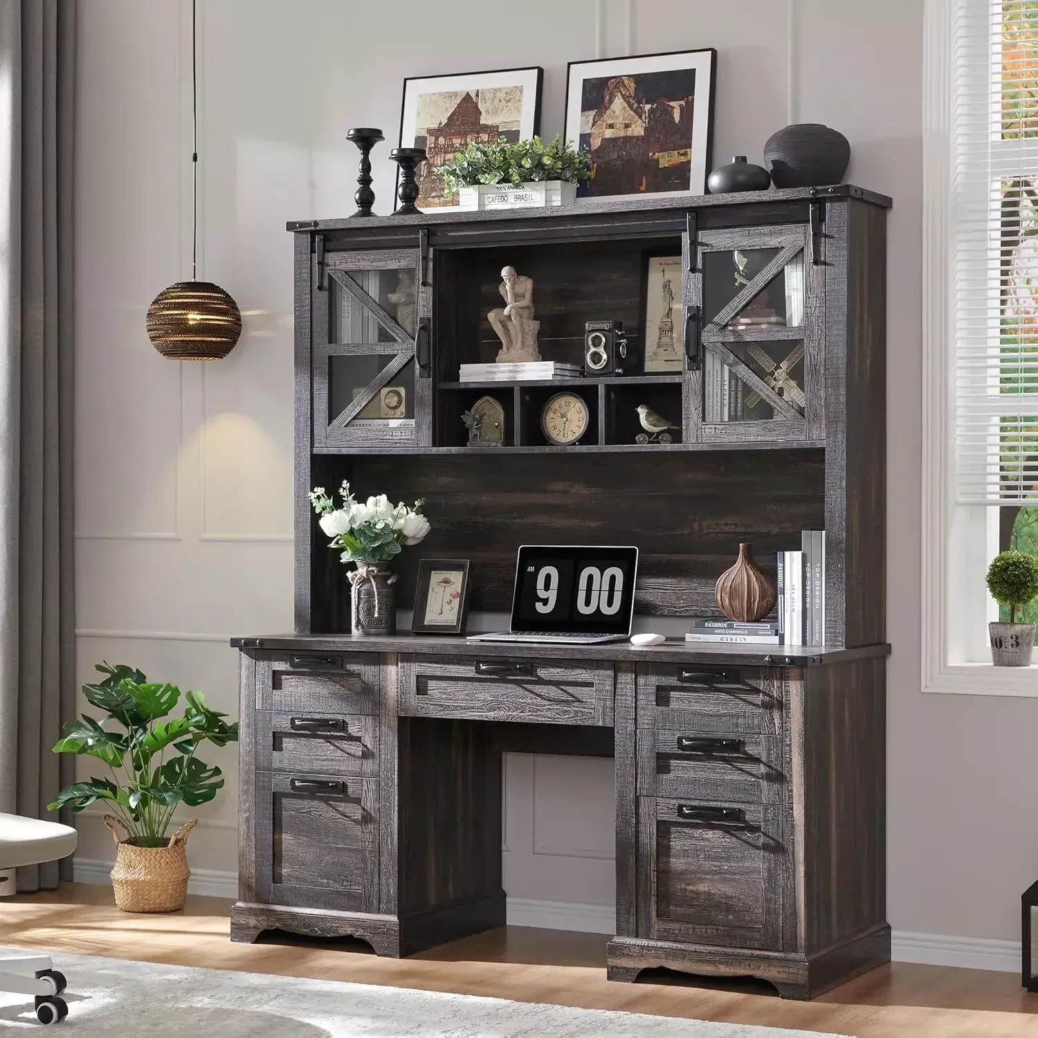 Give your home office the upgrade it deserves with this stunning 60″ Farmhouse Executive Desk with Hutch. Blending rustic character with modern functionality, this desk transforms any room into a productive, stylish workspace. Its grand double pedestal design, warm antique wood tones, and elegant sliding barn door hutch bring the cozy charm of farmhouse décor into your home. Whether you’re tackling daily tasks, organizing paperwork, or diving into creative projects, this desk is built to keep you inspired and organized.