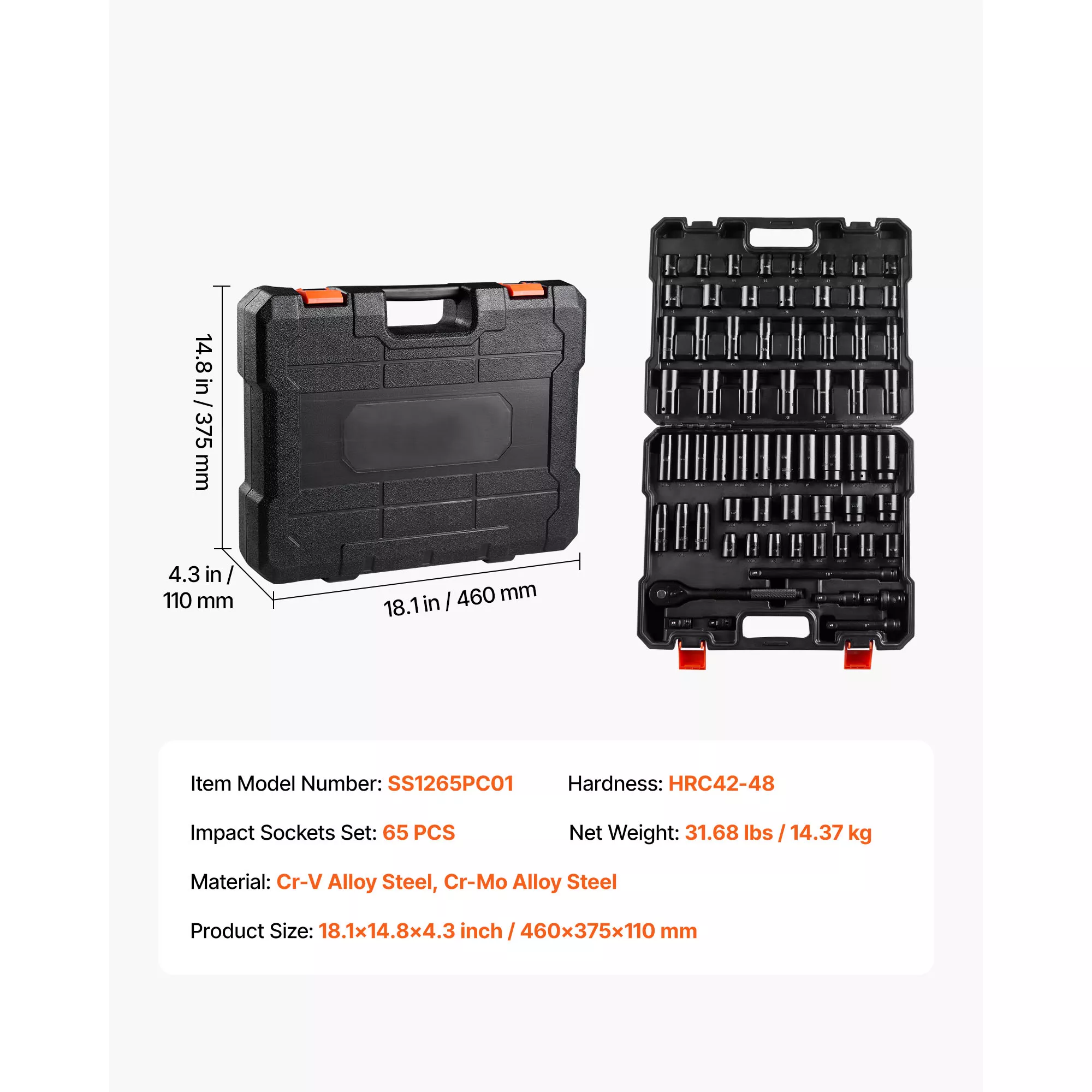 This 65-piece 1/2-inch drive impact socket set is made for people who demand strength, accuracy, and reliability from their tools. Designed for heavy-duty auto repair, mechanical work, and shop use, this set delivers the confidence you need when dealing with stubborn bolts and high-torque applications. Crafted from heat-treated alloy steel with a hardness of HRC 42–48, every socket is built to handle repeated impact without cracking or wearing down.
