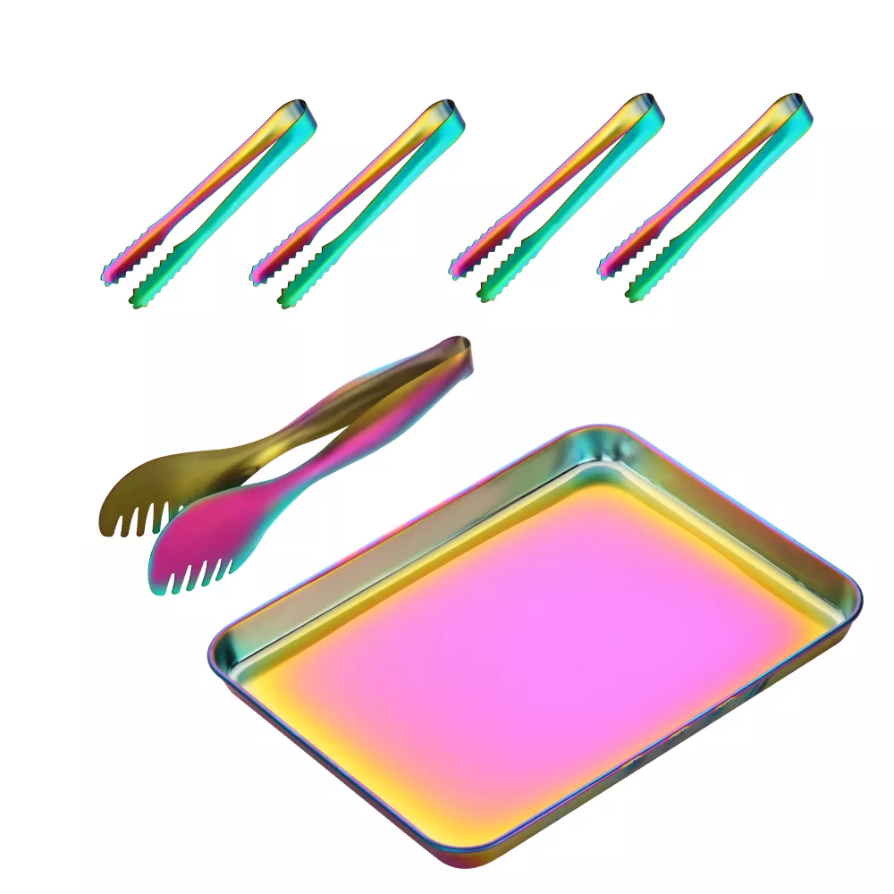 6PCS Rainbow Stainless Steel Mini Serving Set with Ice Tongs and Dessert Trays