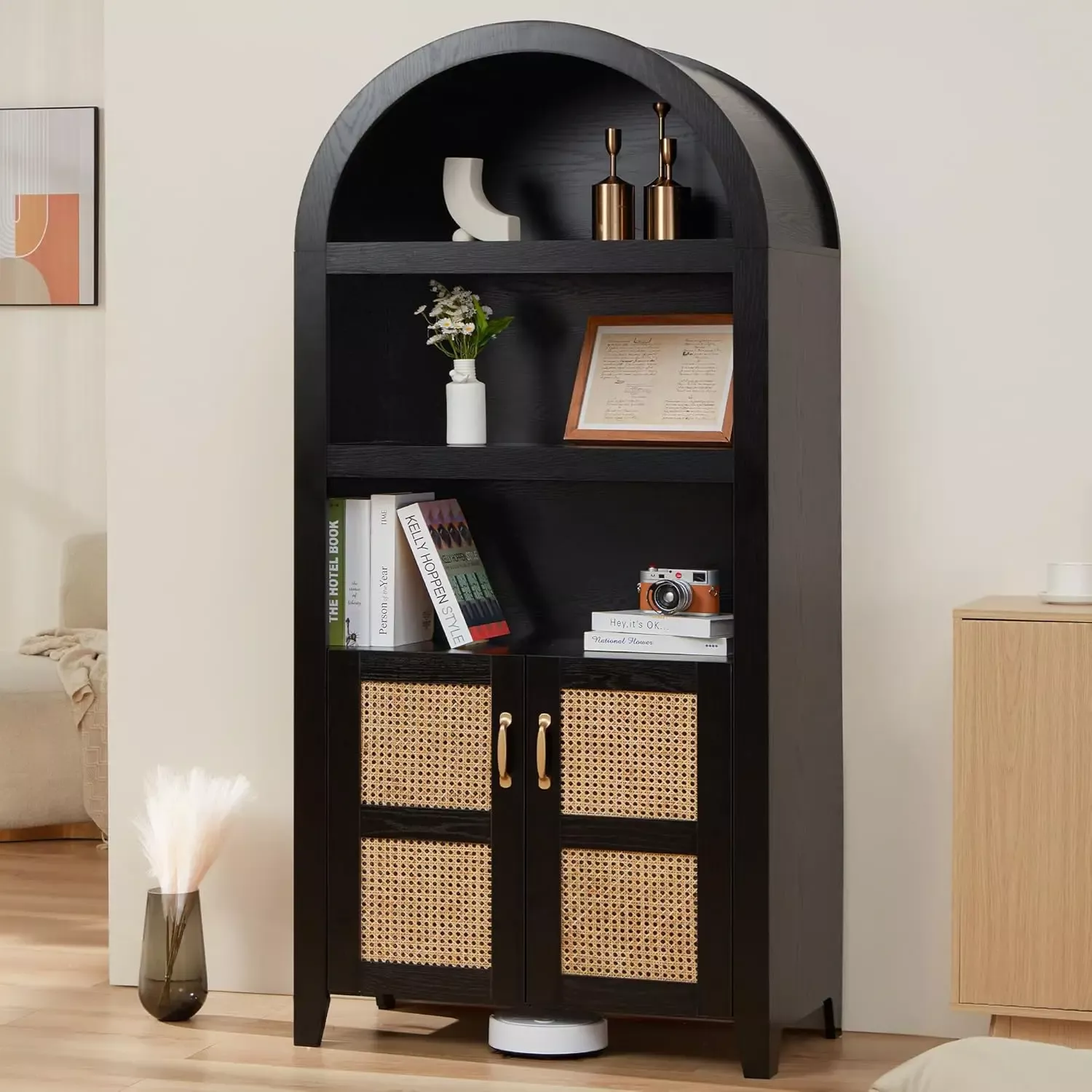 72″ Arched Storage Cabinet with Beech-Rattan Door, Adjustable Shelf Wooden Bookcase