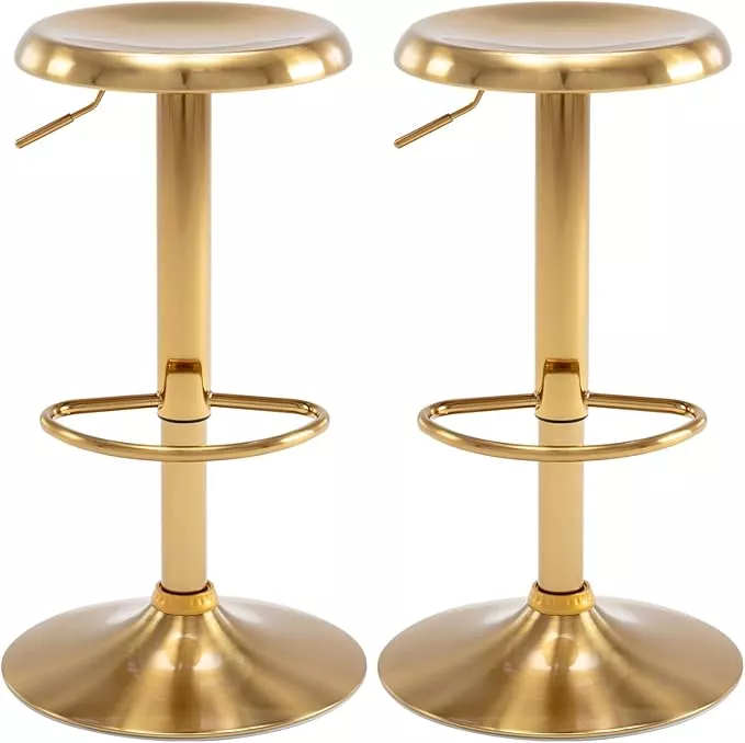 Elevate the style and comfort of your space with this set of two adjustable bar stools. With a sleek, contemporary design featuring gold-brushed metal and a round, concave seat, these stools are the perfect addition to your kitchen island, home bar, or pub area. Designed to blend retro charm with modern simplicity, these stools are as fashionable as they are functional. Whether you’re enjoying a meal at your kitchen counter or entertaining guests at your home bar, these stools make every moment feel special.