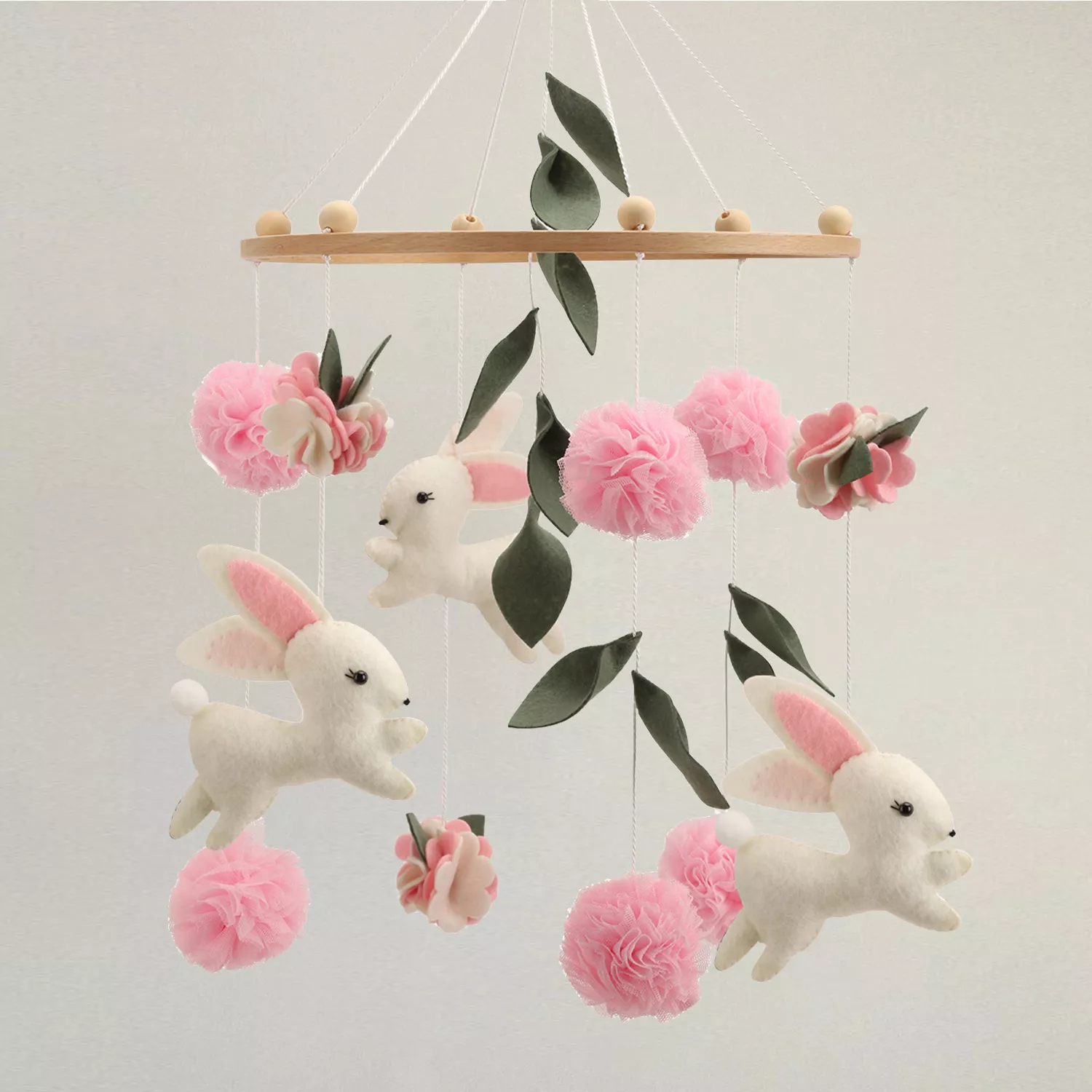 Make your baby’s nursery extra special with this enchanting bunny mobile. Not only does it serve as a charming decoration, but it also supports early development and provides calming moments throughout the day. Add this beautiful mobile to your nursery setup and give your little girl a gift of joy, comfort, and endless fascination. Bring home this adorable bunny mobile and watch your baby’s eyes light up with curiosity and delight.
