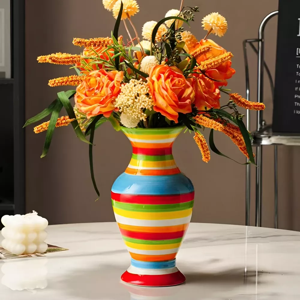 Transform any room into a vibrant sanctuary with this beautifully designed Ceramic Geometric Stripes Vase. Its modern and artistic pattern of colorful stripes effortlessly complements any décor, adding a pop of color and an instant visual appeal. Perfect for holding fresh flowers, dried arrangements, or even as a standalone centerpiece, this vase is an essential home accessory that brings personality and sophistication to your space.