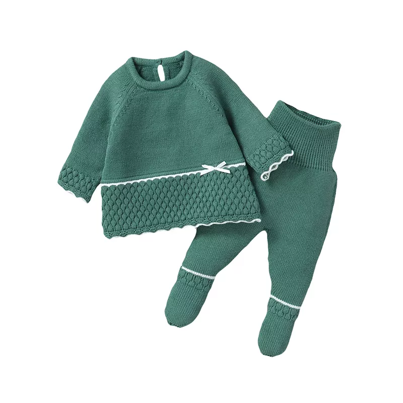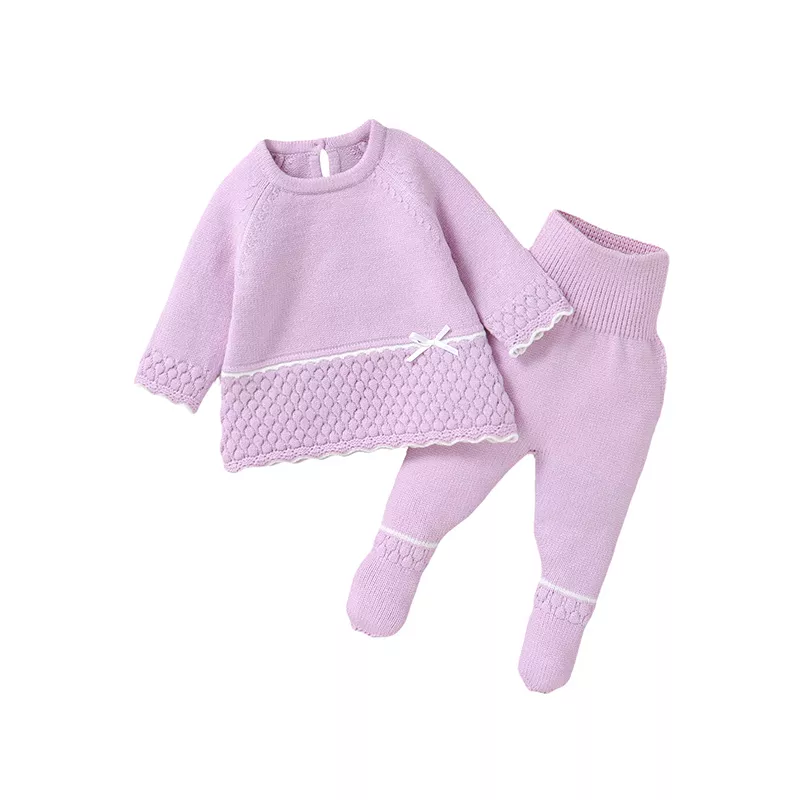 This outfit is ideal for cooler days in spring, fall, and winter, keeping your baby snug whether you’re enjoying a stroll, taking photos, or relaxing at home. The pullover style and stretchy worsted-knit fabric make dressing quick and fuss-free, while the foot-wrapping trousers help keep tiny toes warm without the need for extra socks.