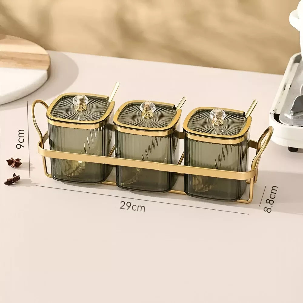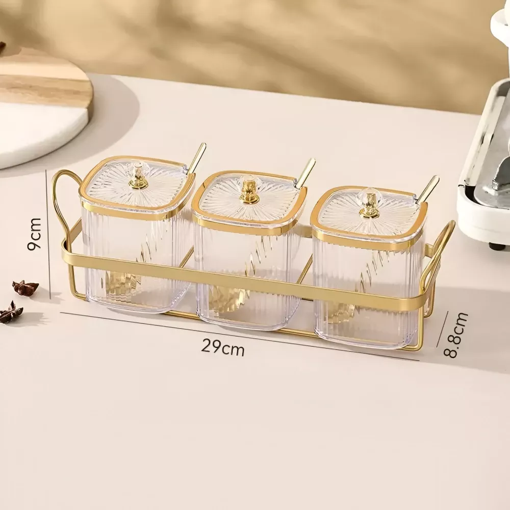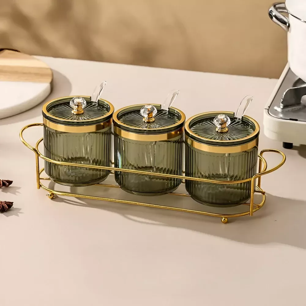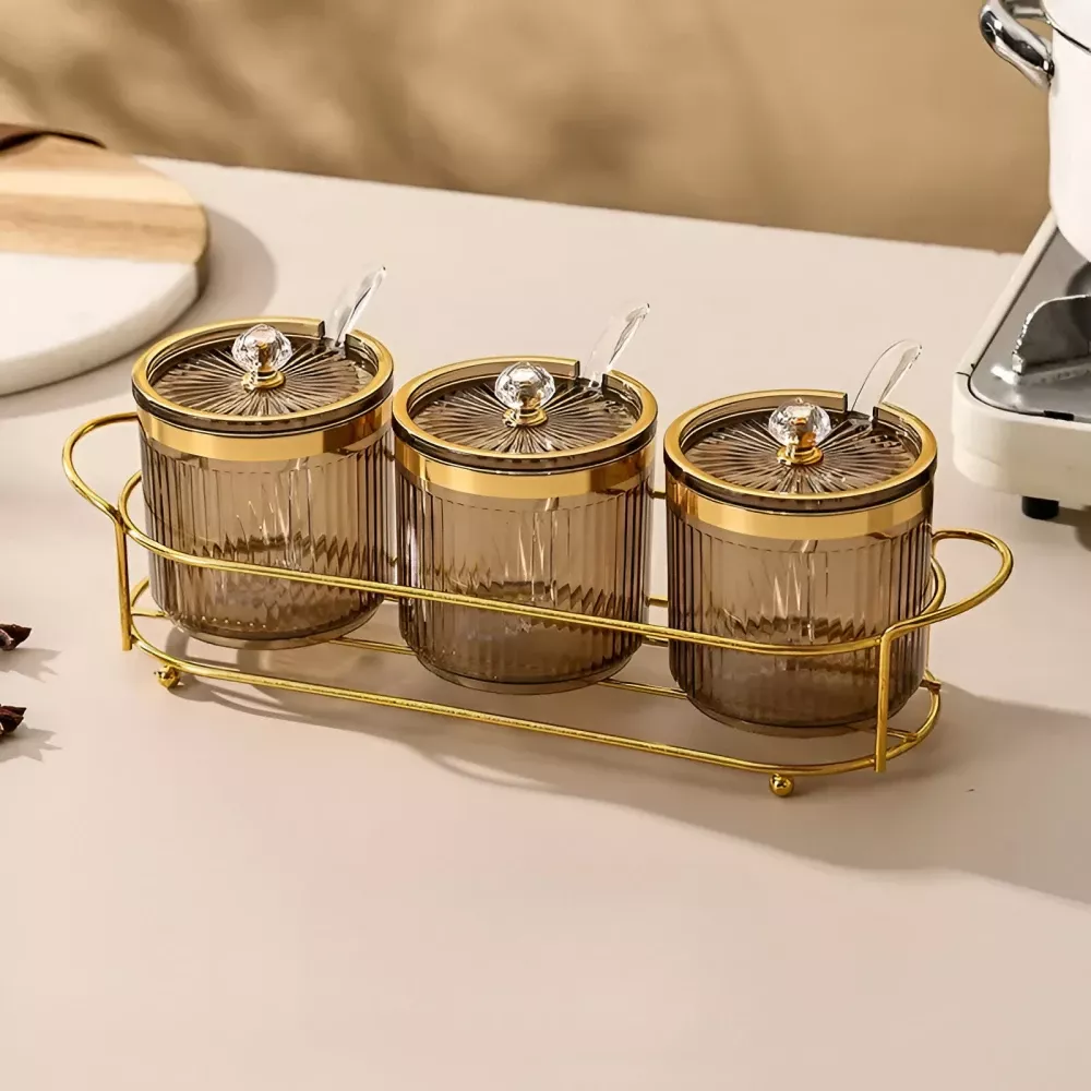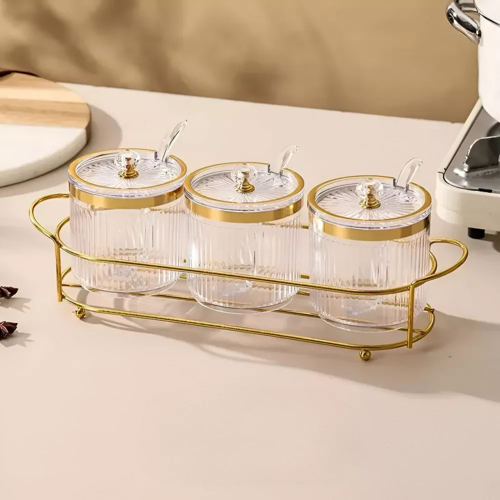 Transform your kitchen countertop with this Elegant Transparent Gold-Trimmed Spice Jar 3Pcs Set — a perfect blend of beauty and practicality. Designed for the modern home, these sleek containers keep your spices, herbs, and condiments fresh while adding a luxurious touch to your cooking space. The transparent body allows you to see contents at a glance, while the gold-plated accents elevate your kitchen décor with effortless sophistication.