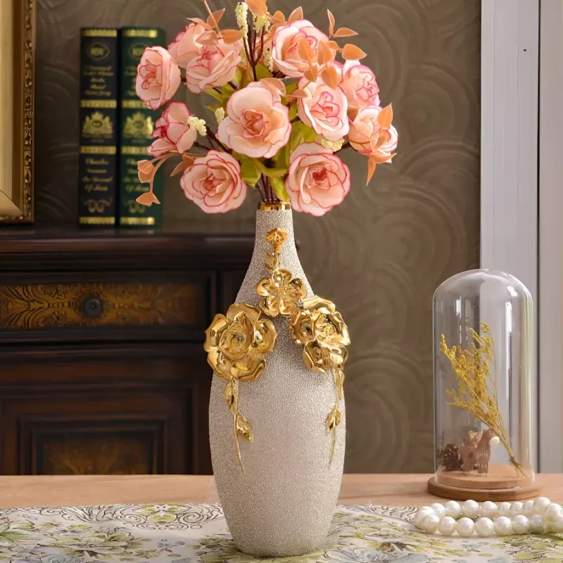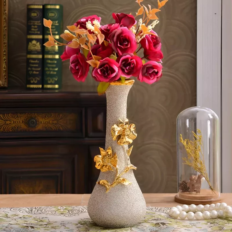 Bring sophistication and charm to your home or office with the Europe Gilt Frosted Porcelain Vase. This stunning, vintage-inspired piece is designed to elevate any room, whether it’s your study, hallway, or living space. Crafted from high-quality ceramic with a frosted finish and gilded accents, this vase blends seamlessly with both modern and classic decor styles. Its intricate design and glossy gold details add a touch of luxury, making it the perfect addition to any setting.