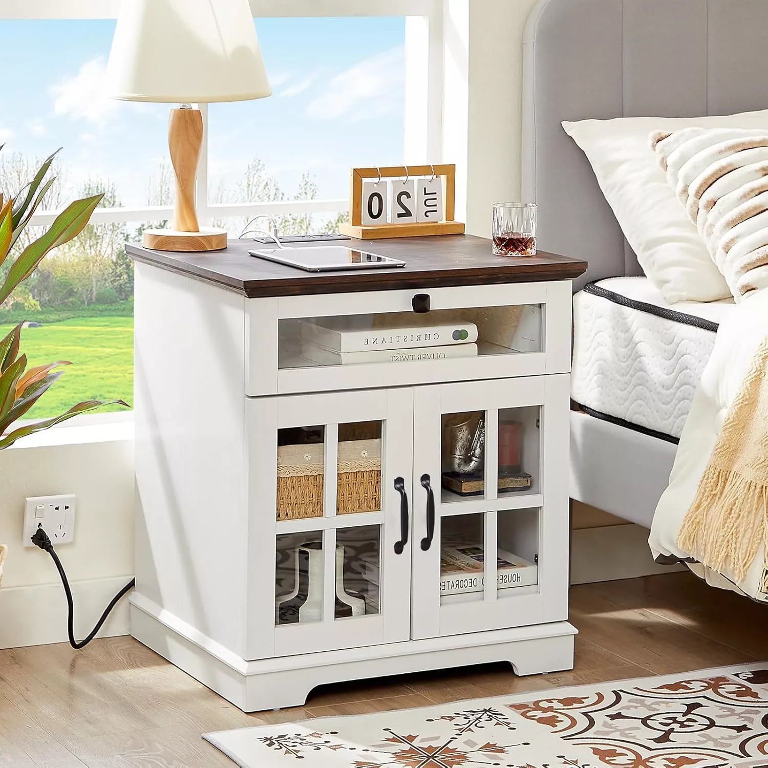 Farmhouse Bedside Table with Charging Station and Barn Door Storage – 24″