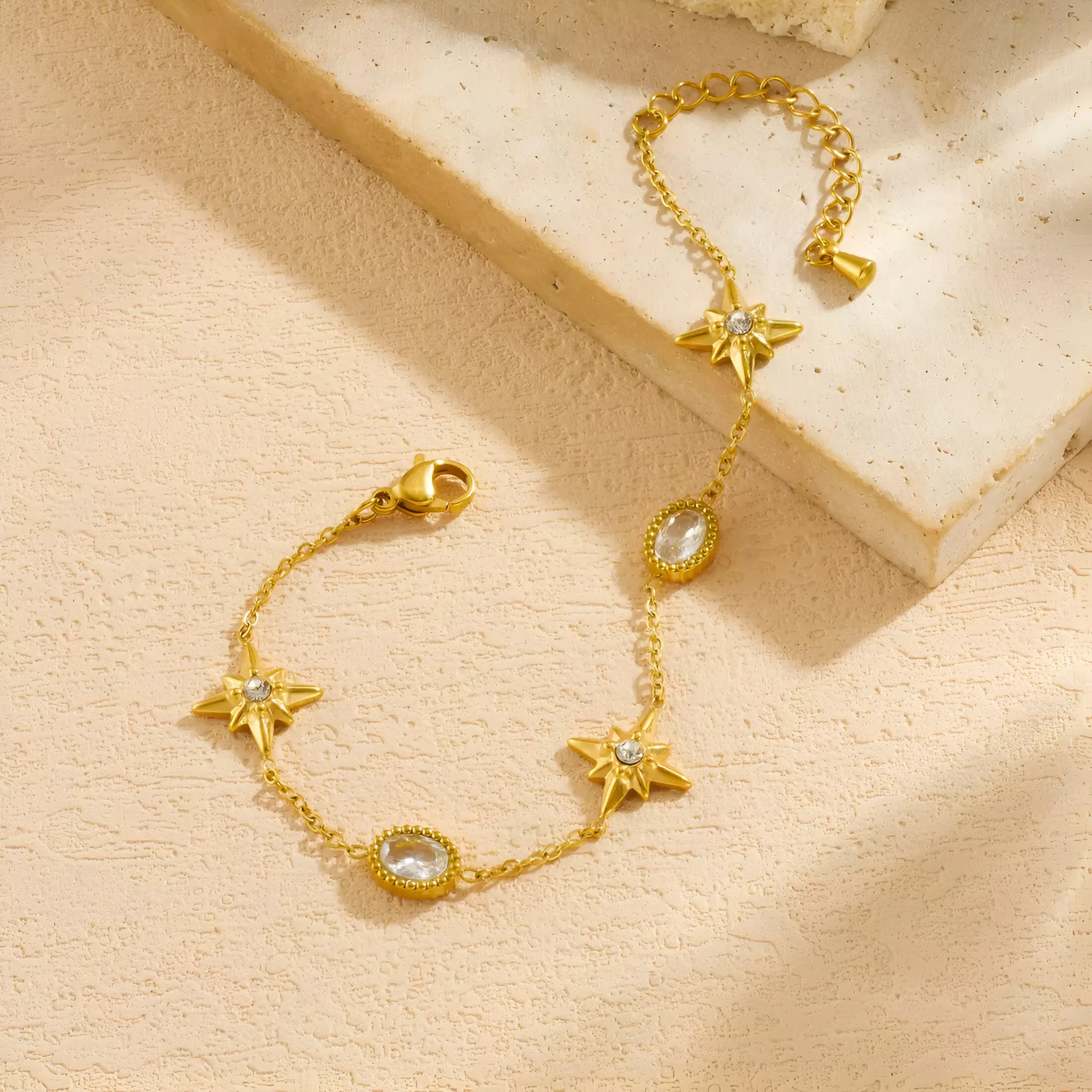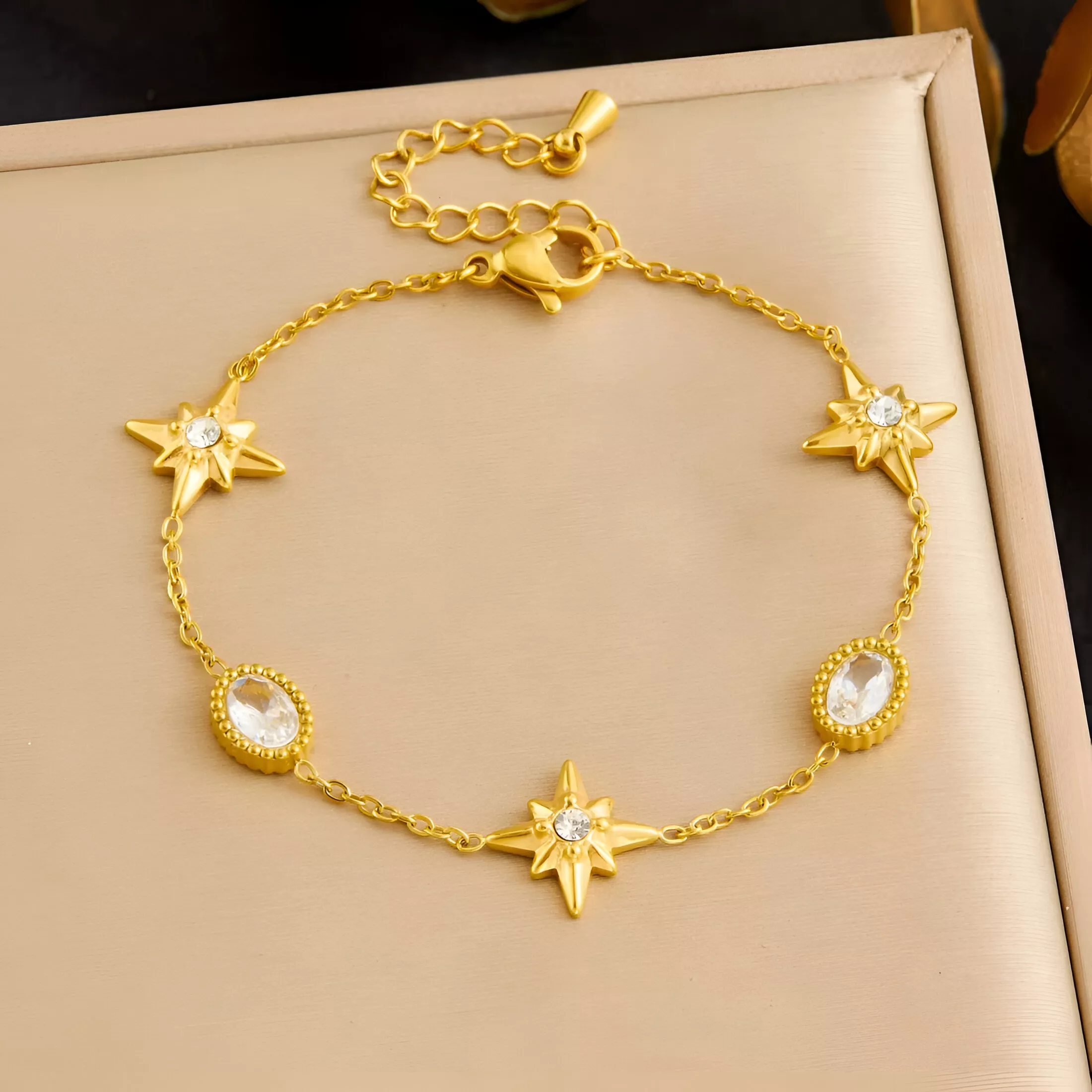 Add a touch of refined beauty to your everyday look with this golden star oval zircon charm bracelet. Designed to shine without being overdone, this piece blends classic elegance with a trendy, modern feel. The smooth golden finish, paired with sparkling white zircon details, creates a graceful bracelet that instantly elevates any outfit. Whether worn alone or layered with other jewelry, it brings subtle luxury to your wrist.