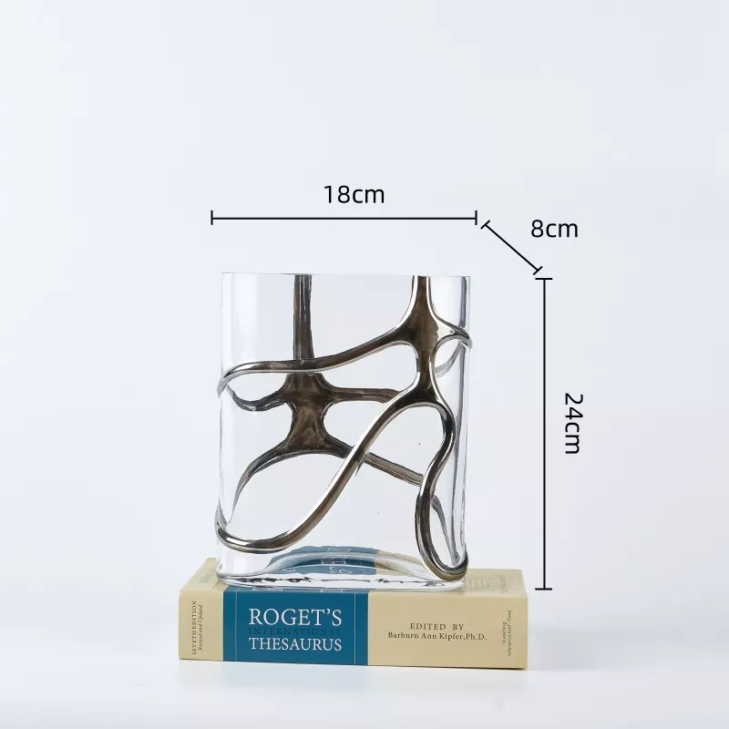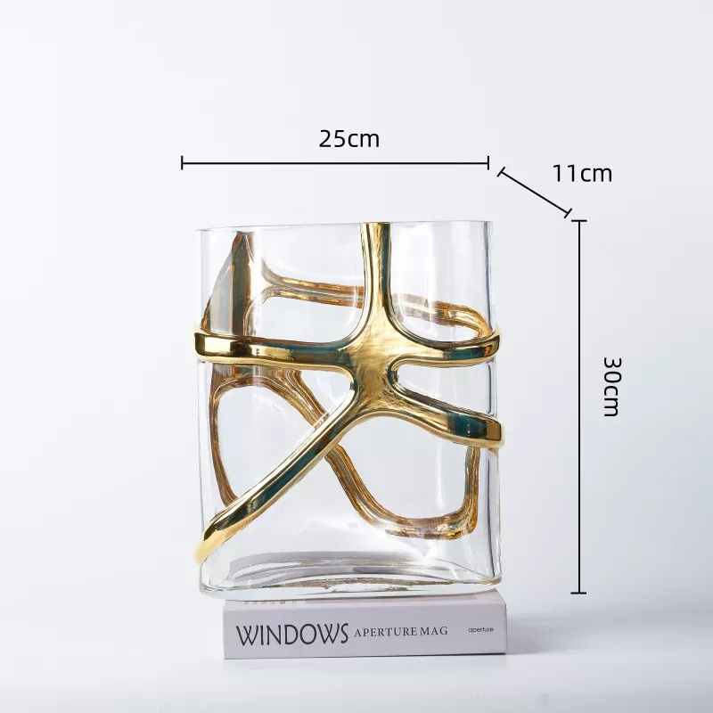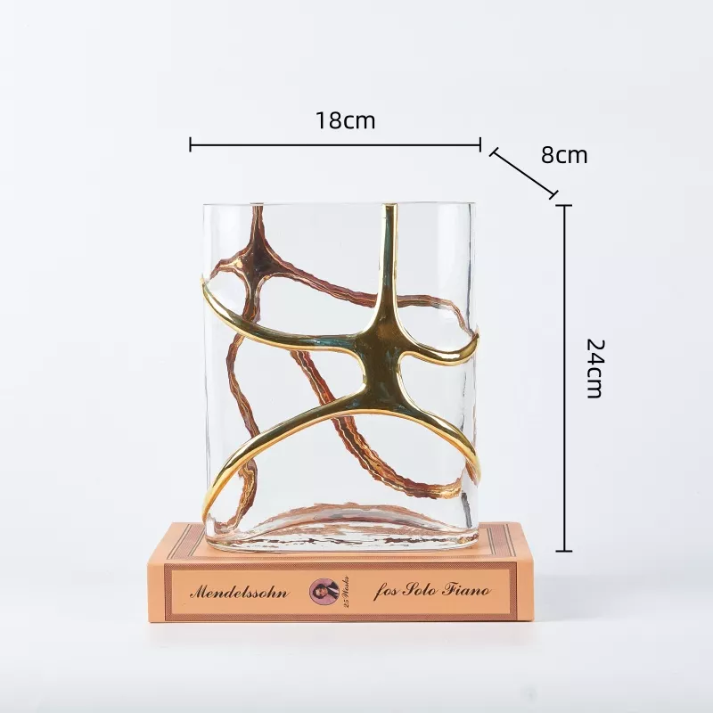 Crafted with precision, the clear glass vase is paired with a gold-toned metal bracket featuring winding cross lines, providing an elegant and contemporary aesthetic. The transparency of the glass allows light to pass through beautifully, giving your plants or decorative elements a stunning display. Whether you’re looking to showcase your favorite flowers, create a hydroponic garden, or simply add a chic touch to your living room, this vase offers the perfect solution.