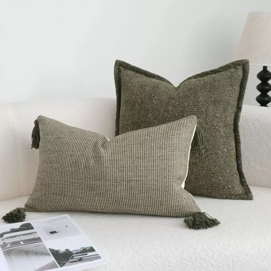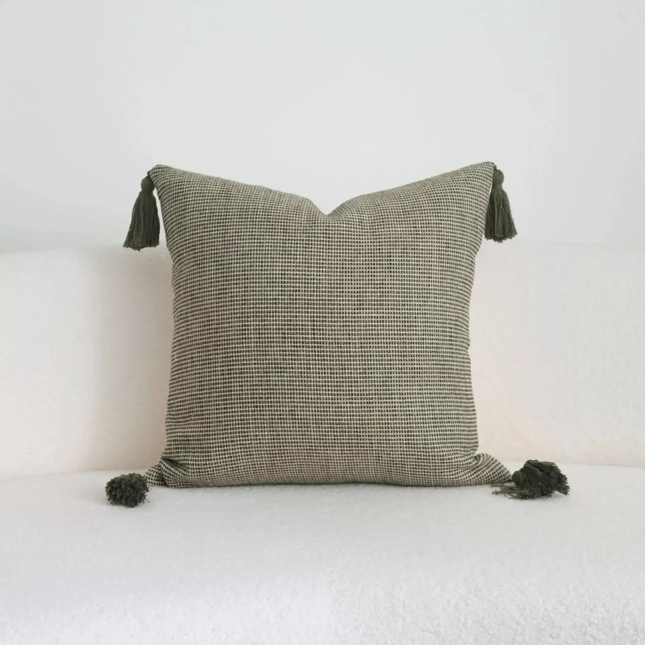Refresh your home with this elegant green grid tassel throw pillow cover, designed to add warmth, texture, and a natural touch to any room. The soft green tone creates a calm and inviting atmosphere, while the subtle plaid jacquard pattern adds visual depth without feeling overwhelming. Finished with charming tassel accents, this decorative pillowcase blends modern simplicity with cozy comfort, making it an easy upgrade for your living room, bedroom, or reading nook.