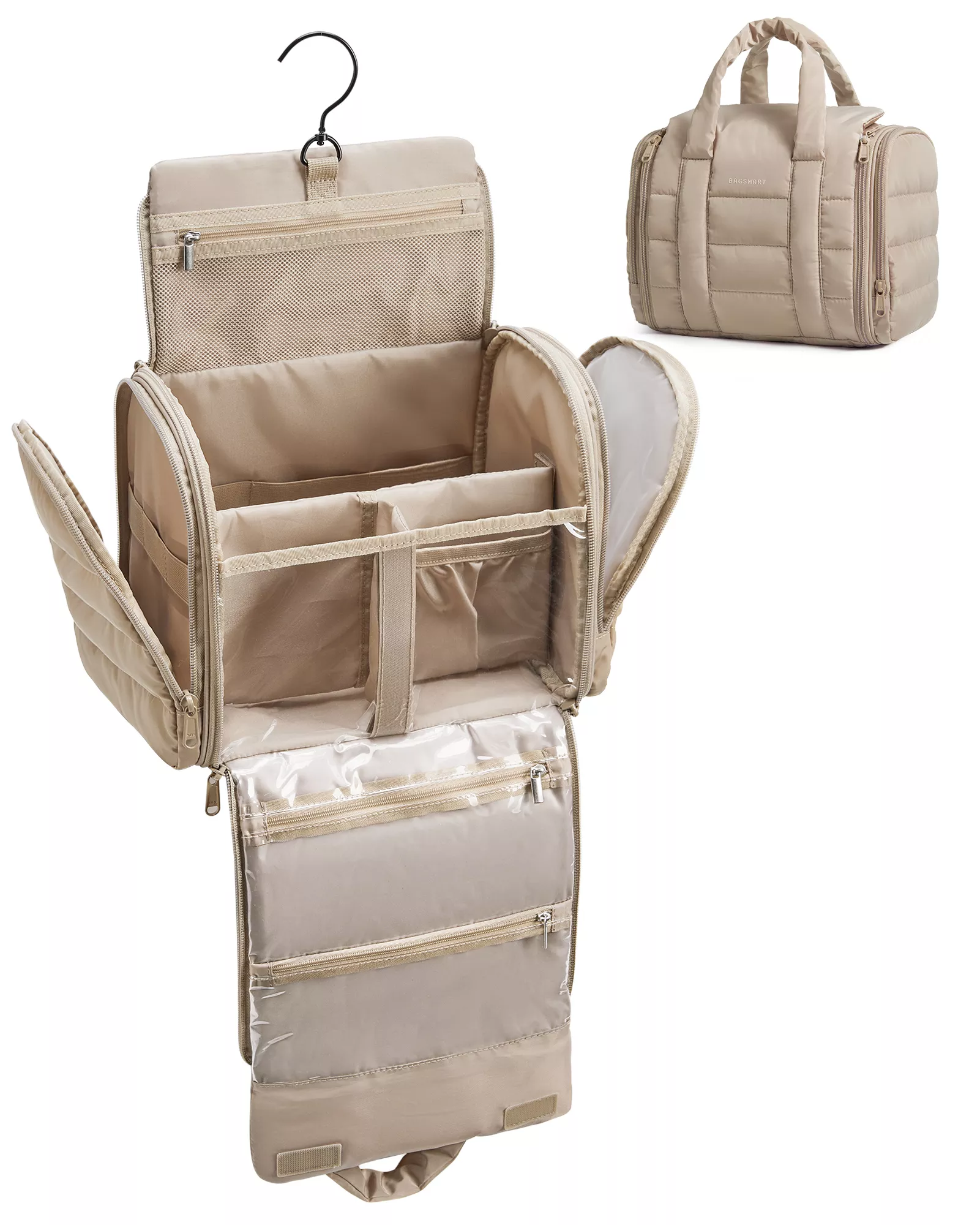 Made from ultra-lightweight, water-resistant polyester with a plush quilted feel, this bag is gentle on your hands yet durable enough for frequent travel. Smooth dual zippers glide easily, and cushioned handles make carrying comfortable. The 360-degree swivel hook allows you to hang it on towel racks, doors, or hooks to free up valuable counter space.