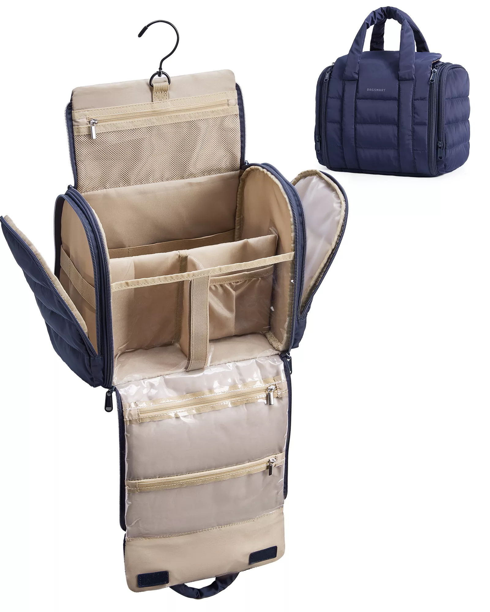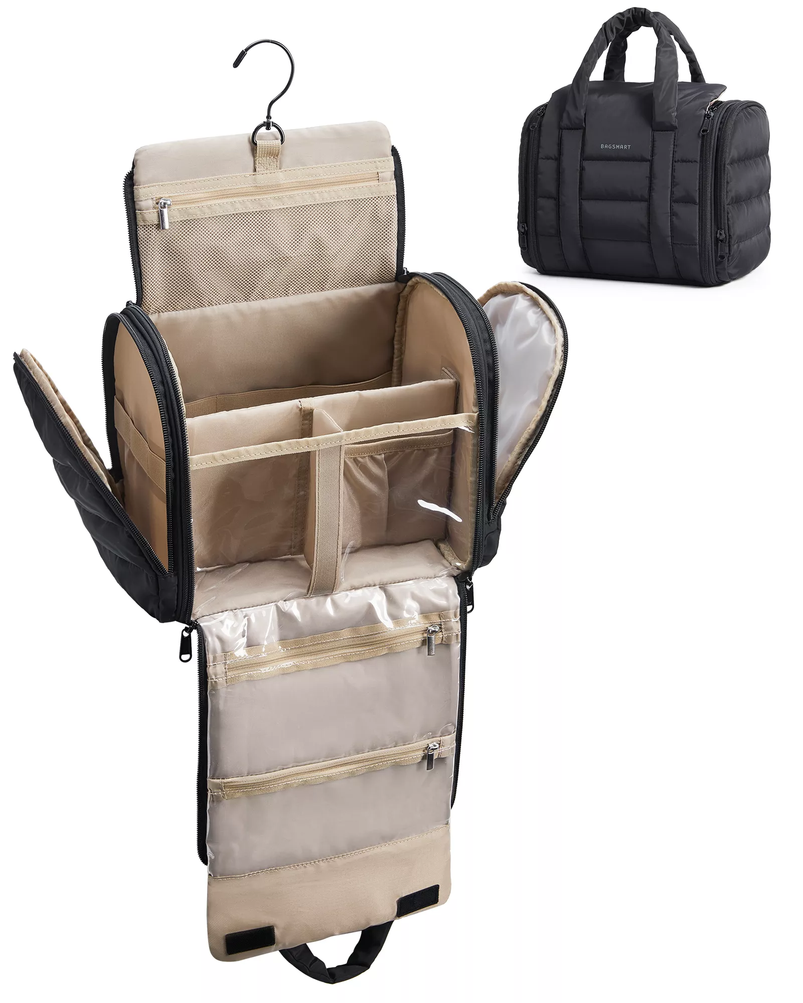 The spacious interior measures approximately 11 x 7 x 9 inches and opens wide so you can see everything at a glance. Adjustable, detachable dividers let you customize the main compartment into one, two, or three sections depending on what you’re packing. Elastic straps hold bottles upright to help prevent spills and leaks, making this bag ideal for shampoo, skincare, and full-size toiletries.