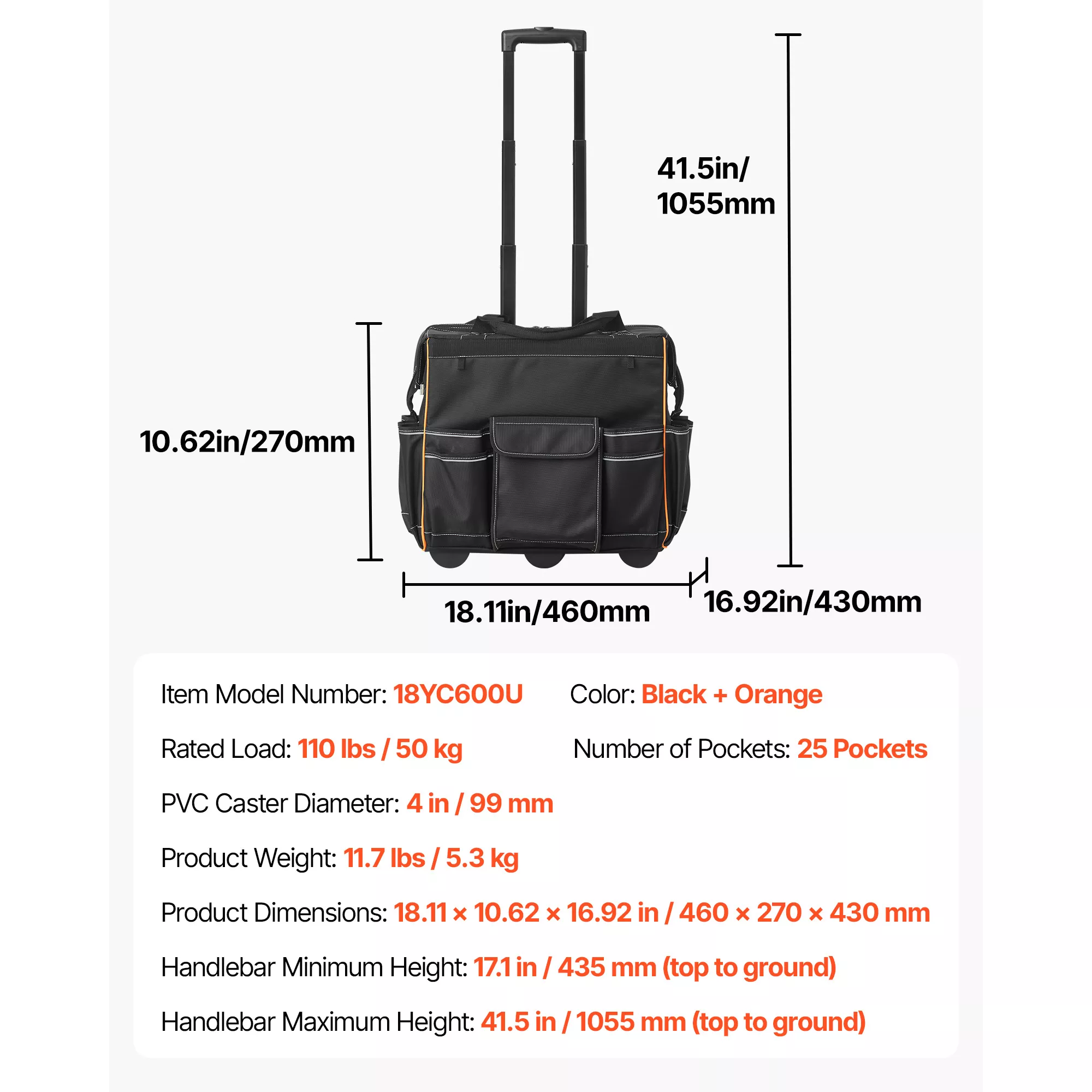 No more digging around for the right tool. This rolling tool bag features 25 well-placed pockets that make organization simple and efficient. With 14 interior pockets and 11 exterior compartments, every tool has its place. The bright orange interior lining improves visibility, so you can spot what you need in seconds, even in low-light conditions.