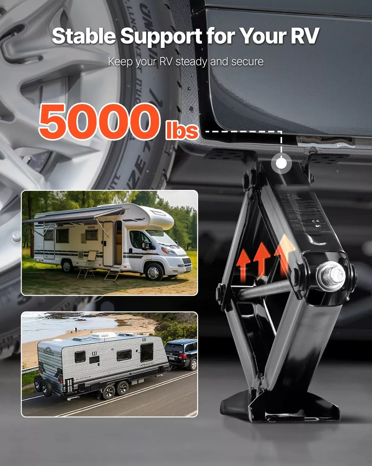 Each scissor jack delivers an impressive 5000 lb load capacity, giving your RV dependable support you can trust. The all-steel construction is treated with a durable anti-rust coating, helping it stand up to rain, dirt, and outdoor exposure. A reinforced screw system and thickened structure add extra strength for long-term use, even under heavy pressure.