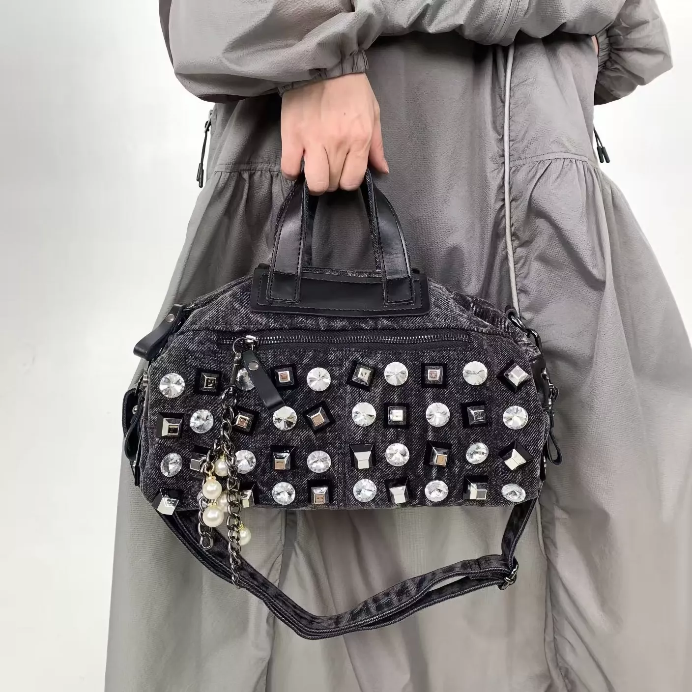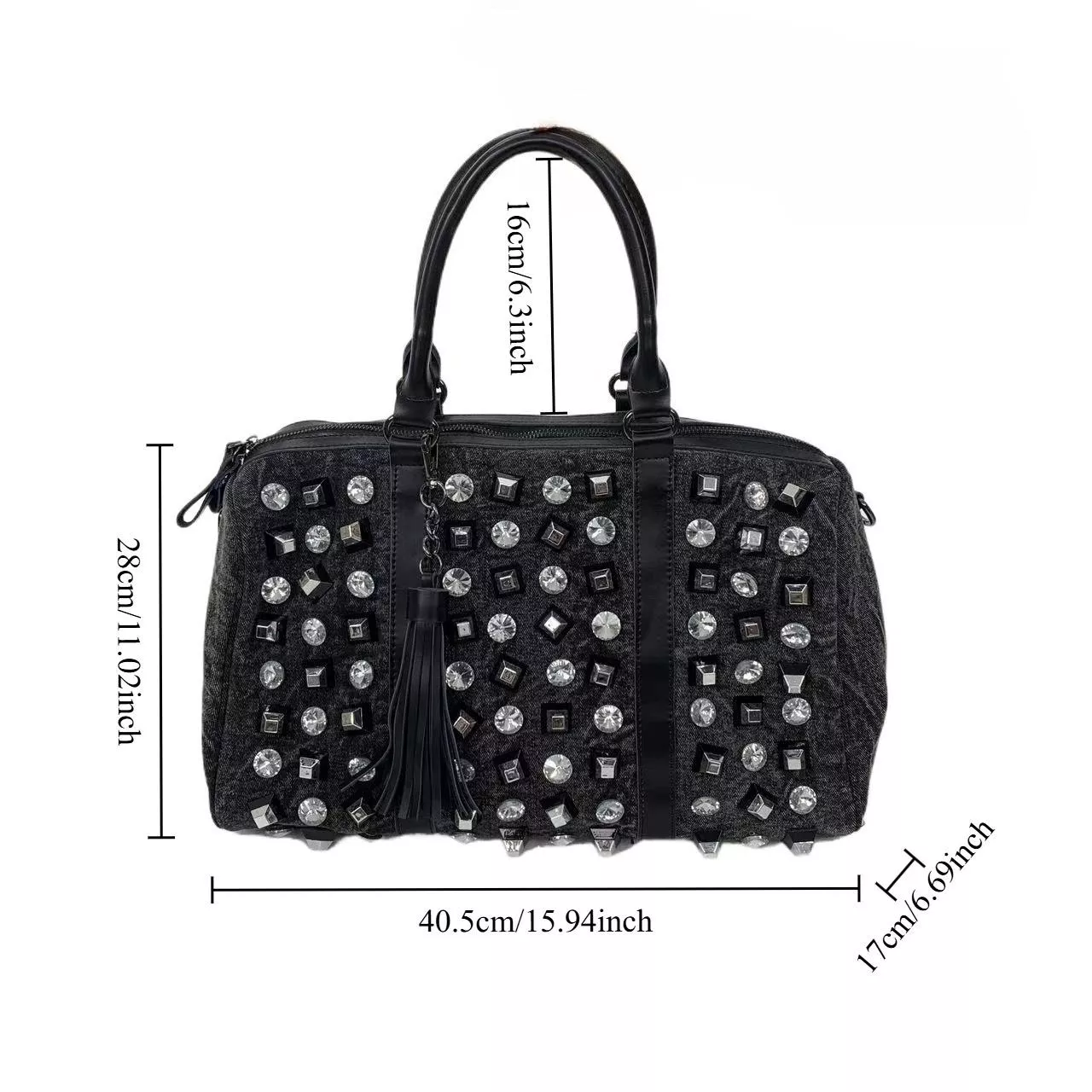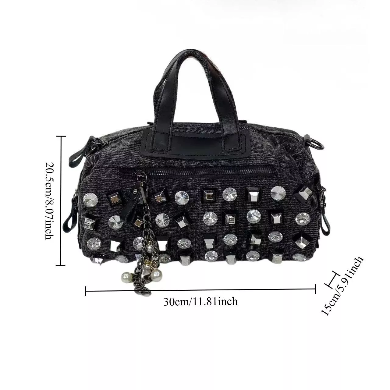 What sets this bag apart is its perfect combination of glamour, convenience, and durability. The rhinestone embellishments make a statement, catching the light and adding sparkle wherever you go, while the soft denim construction ensures it’s as comfortable as it is stylish. Its roomy interior makes it ideal for anyone who needs to carry more—whether it’s for your daily work essentials or everything you need for a spontaneous weekend trip. The zipper closure offers peace of mind, keeping your valuables safe and secure.