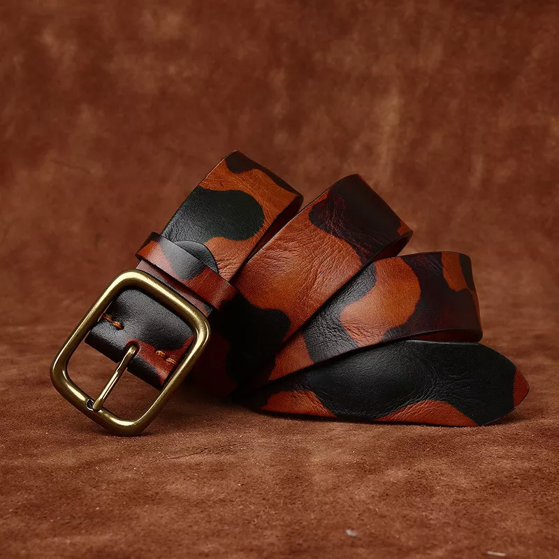 Unlike ordinary belts made from thin split leather, this belt uses full-grain cowhide—the strongest and highest-quality part of the hide. Its heavy-duty tanning and vintage finish give it a lived-in look that gets better over time. The stylish camouflage pattern adds street-inspired charm that’s currently trending across social media and fashion circles. The real brass buckle not only looks premium, but also resists corrosion, ensuring lasting wear.