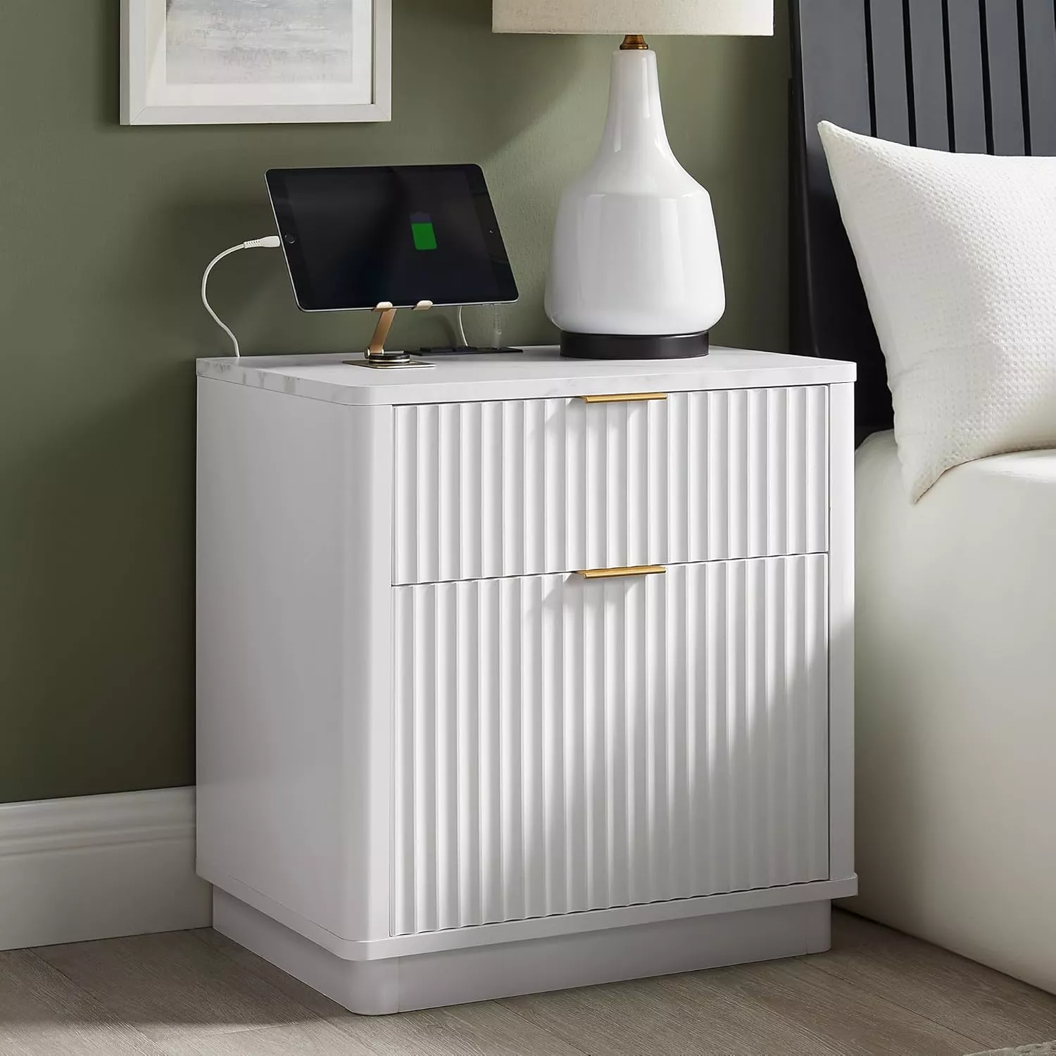 Modern Fluted Nightstand Set of 2 with Charging Station, 2 Drawers, 23 Inch