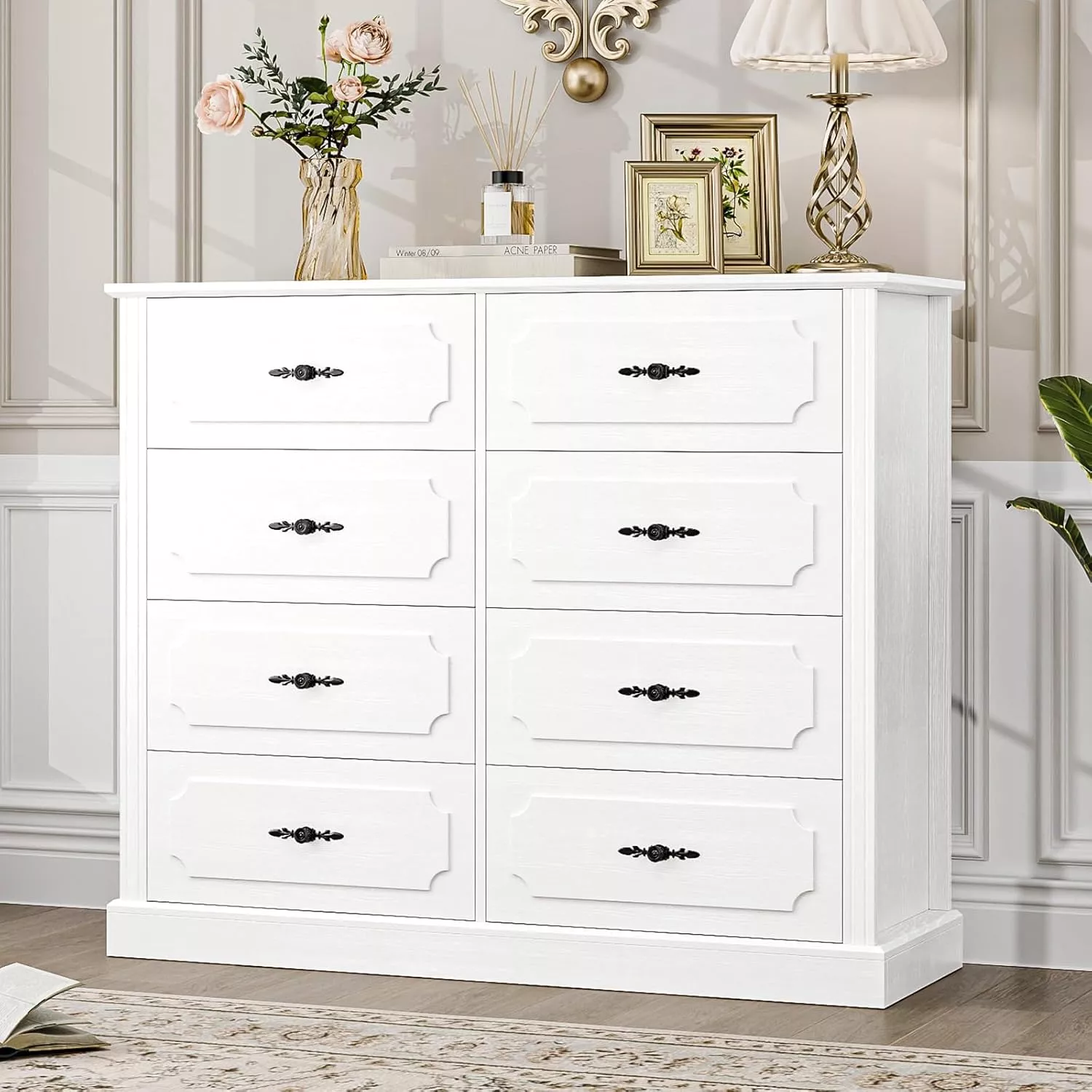This dresser isn’t just a piece of furniture; it’s a solution to your storage needs with a touch of style. It’s perfect for any room that requires organization without sacrificing design. The 8 spacious drawers can easily accommodate a variety of items, making it ideal for a clutter-free living room, bedroom, or hallway. Its modern farmhouse style complements a wide range of décor, from contemporary to rustic, making it the ideal addition to your home.