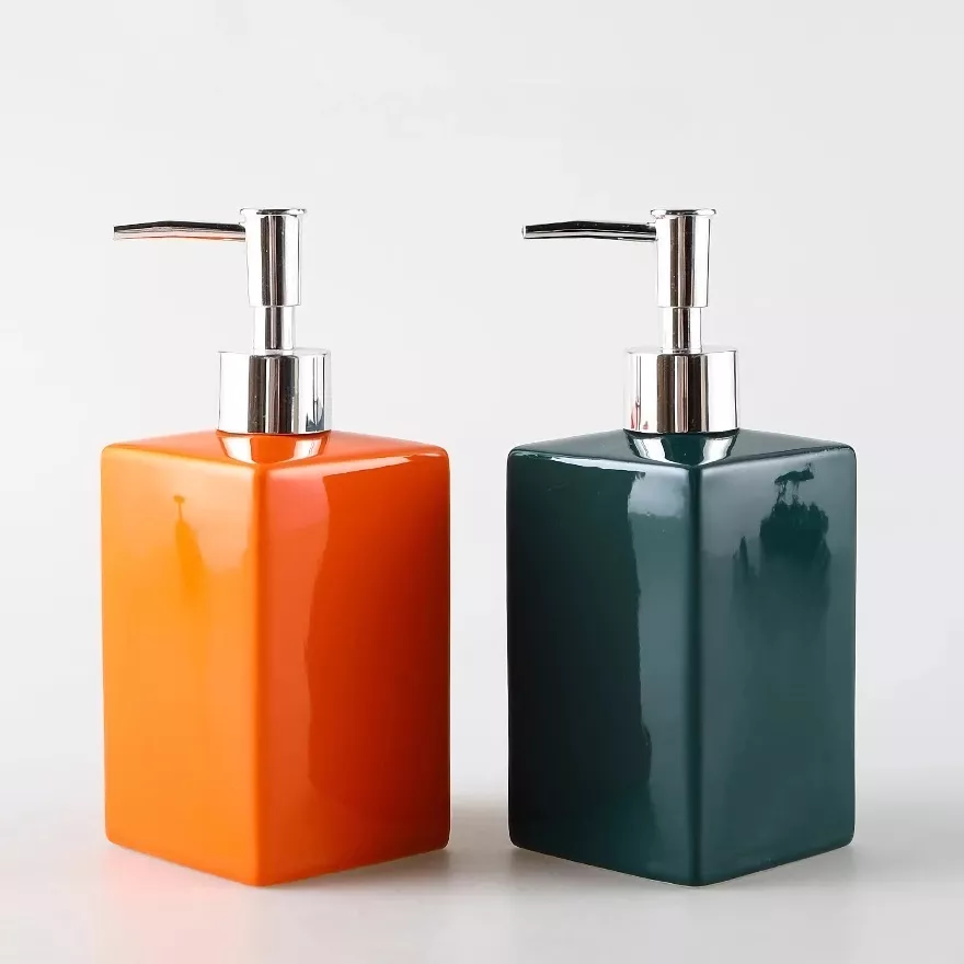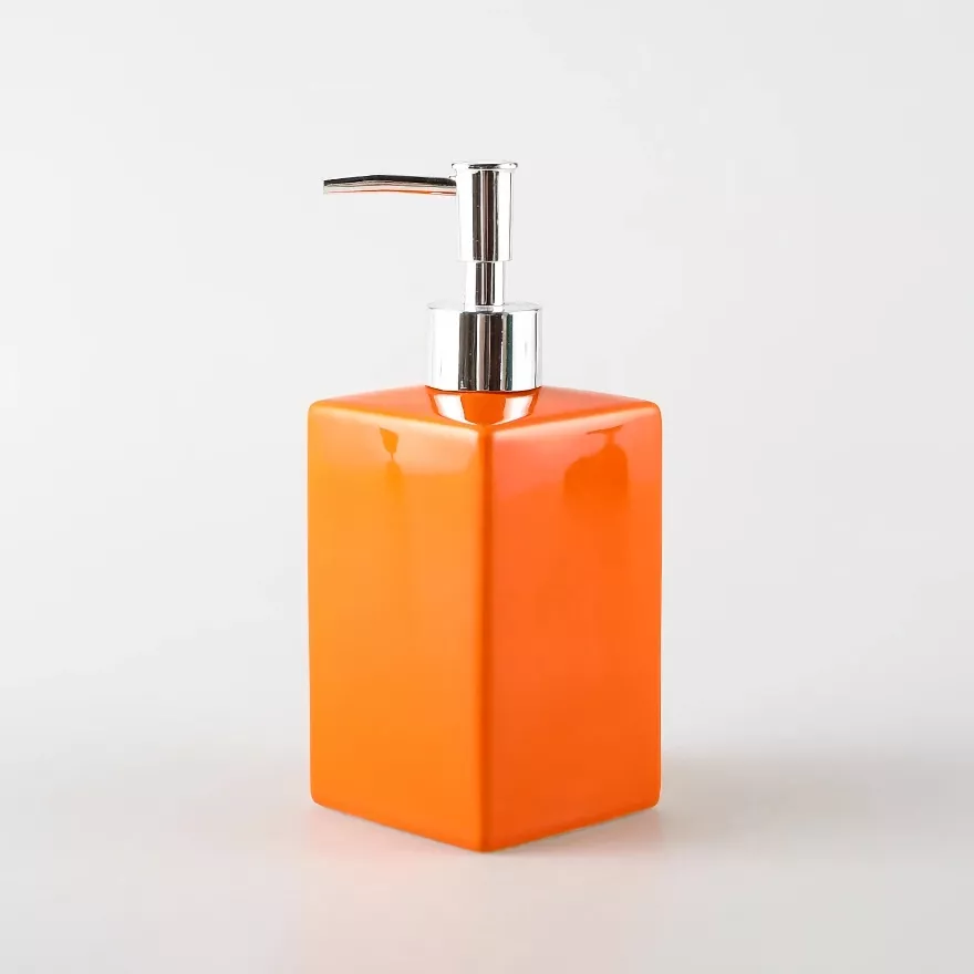 Add a pop of color and refined elegance to your space with this orange square ceramic lotion and soap dispenser. Designed to blend beauty with everyday function, this piece instantly upgrades the look of your bathroom, kitchen, or vanity. The glossy ceramic body paired with a sleek silver-plated pump creates a clean, modern aesthetic that feels both fresh and timeless.