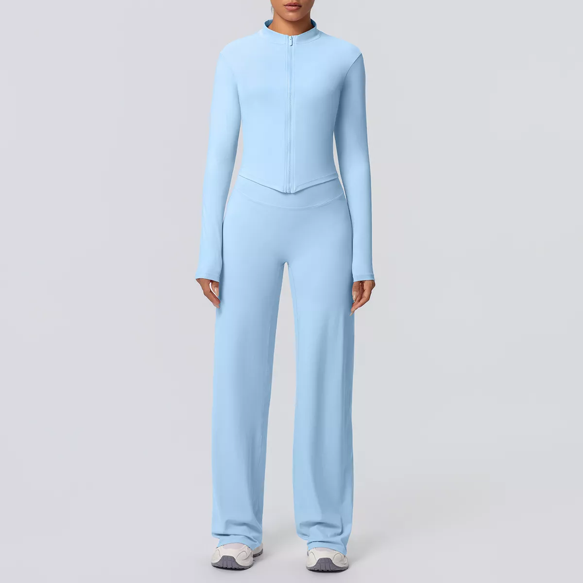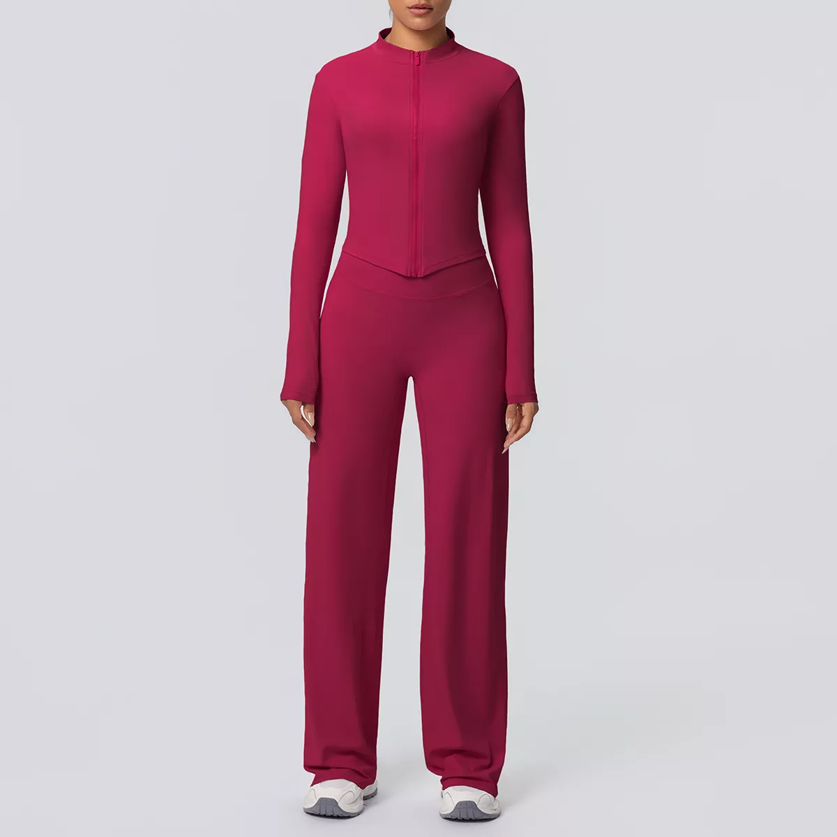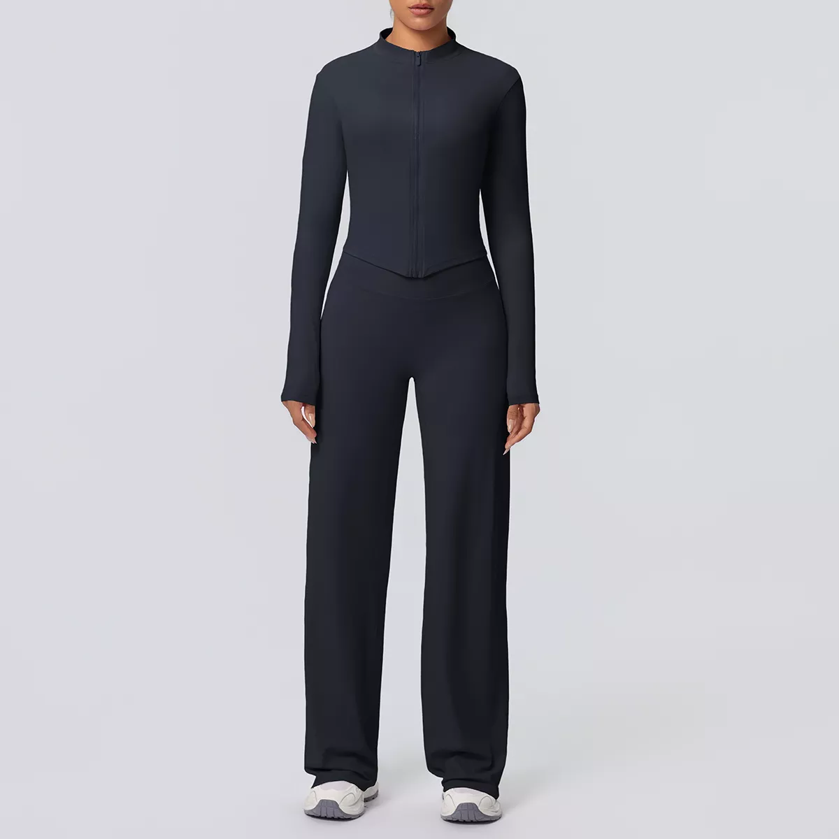 Quick-Dry Yoga Set with Zip Long Sleeve Top & High-Waist Wide Leg Pants