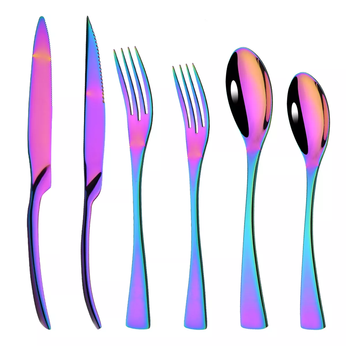 Bring color and elegance to your table with the 6-Piece Rainbow Stainless Steel Dinnerware Set. Crafted from premium 18/10 stainless steel, this eye-catching set adds a touch of sophistication and fun to every meal. Each piece reflects a stunning iridescent rainbow finish that makes dining not just an everyday habit, but a joyful experience. Perfect for both casual meals and special gatherings, this set blends beauty, balance, and durability for lasting style.