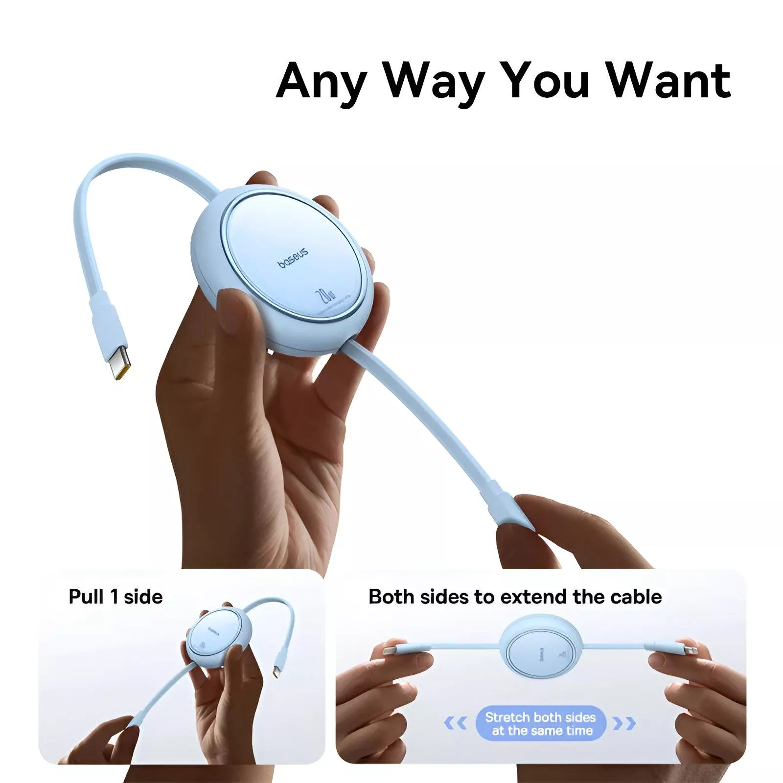 The smooth retractable design lets you pull one side or both sides to reach the length you need. With multiple preset lengths, it adapts easily to different charging situations, from bedside tables to car consoles. When you’re done, the cable retracts neatly back into its housing, leaving zero cable clutter.