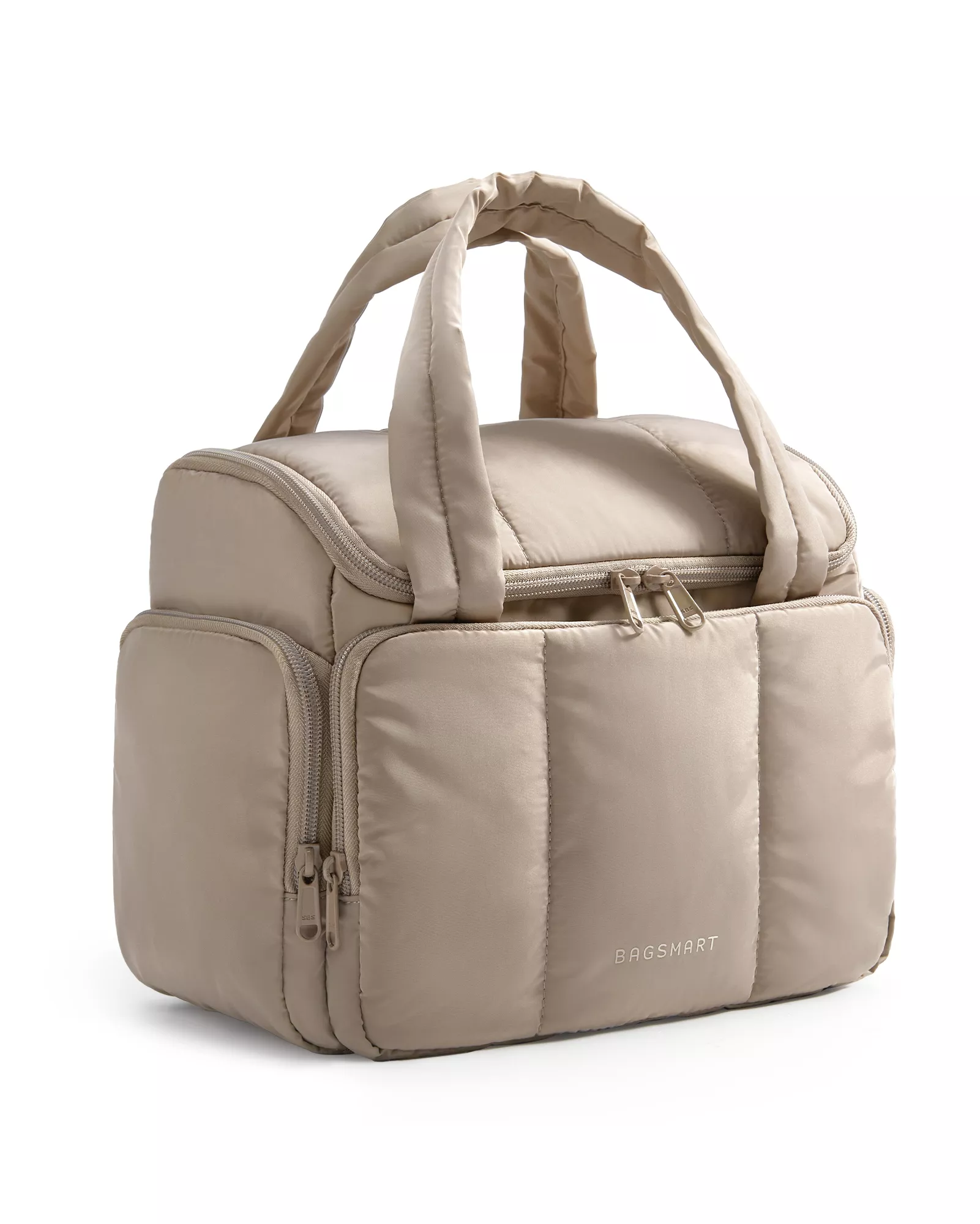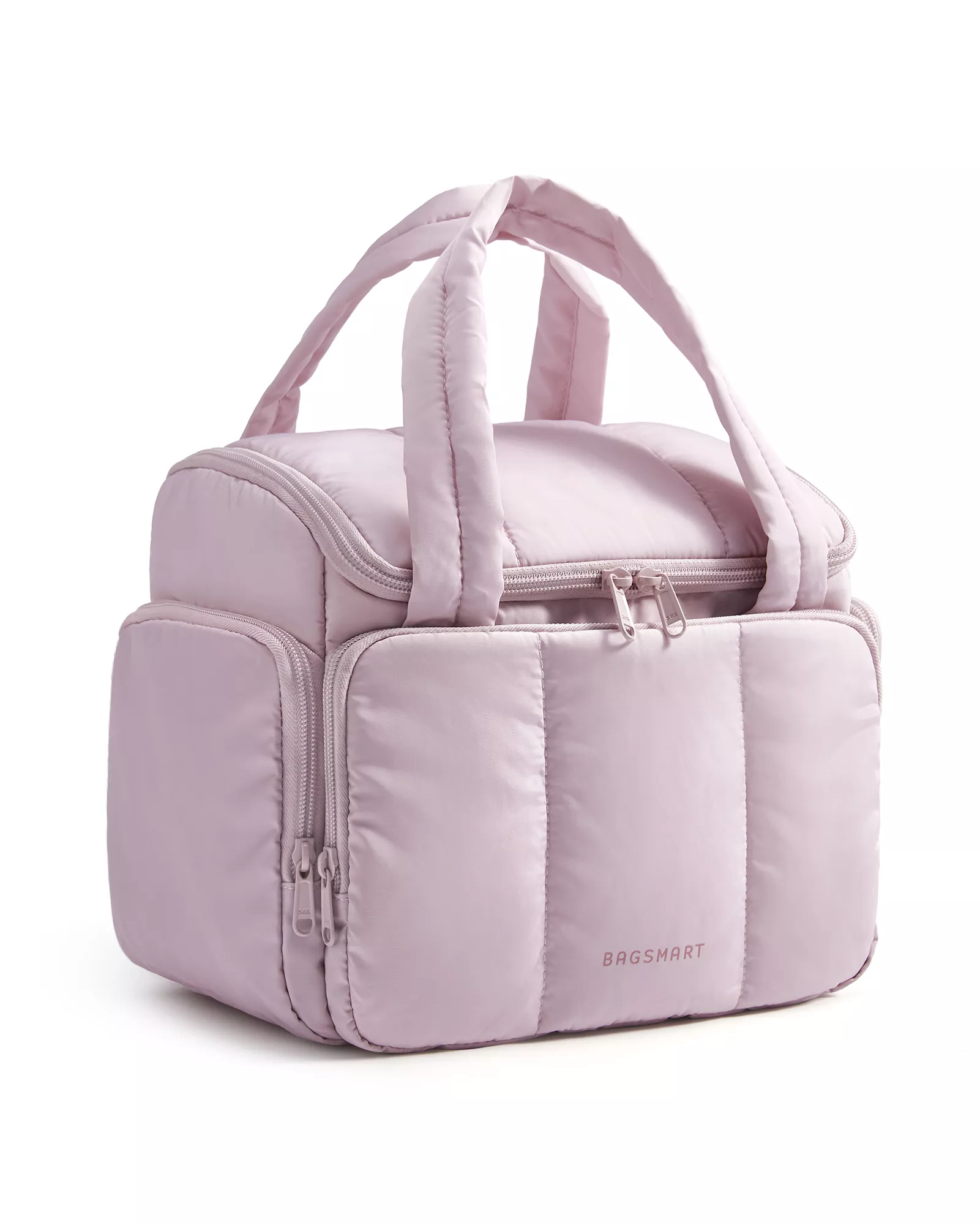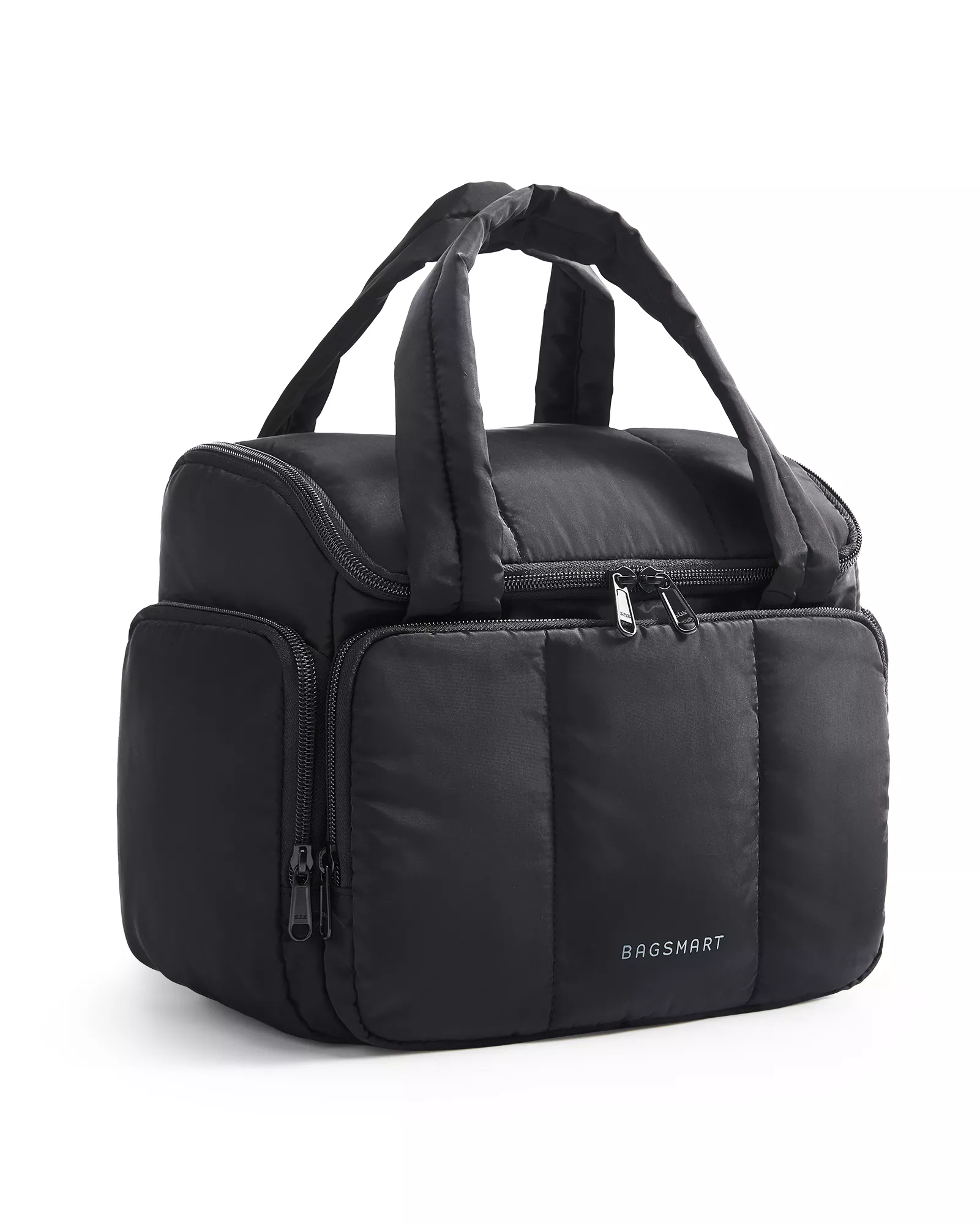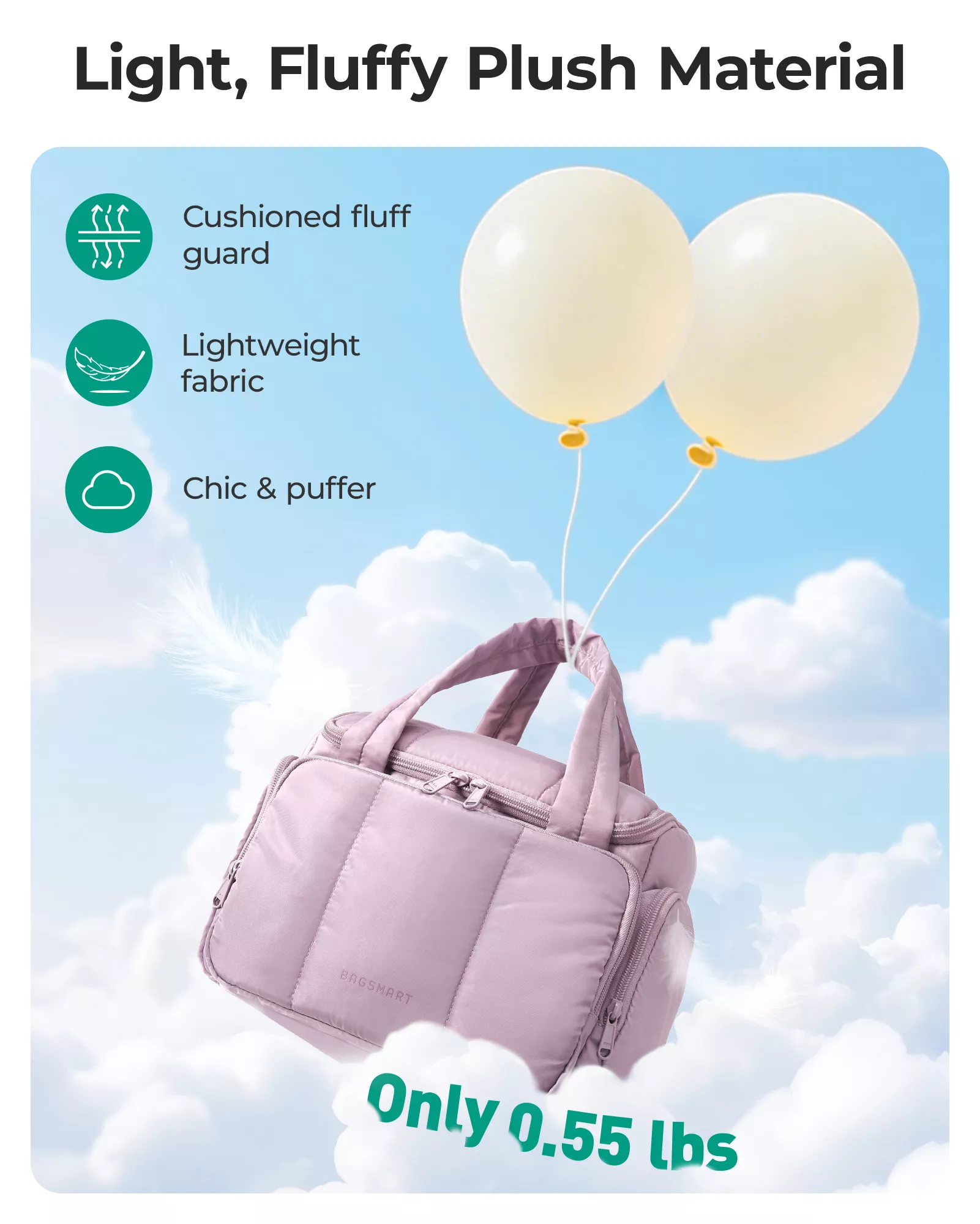 What truly sets this toiletry bag apart is its balance of softness, strength, and smart functionality. The puffy polyester exterior is lightweight yet durable, with water-resistant protection that helps handle spills, leaks, and unexpected moisture. Dual padded handles provide a secure grip while traveling, and the wide 180-degree opening allows quick access, even when you’re in a hurry. It’s designed for people who want organization without sacrificing style or comfort.