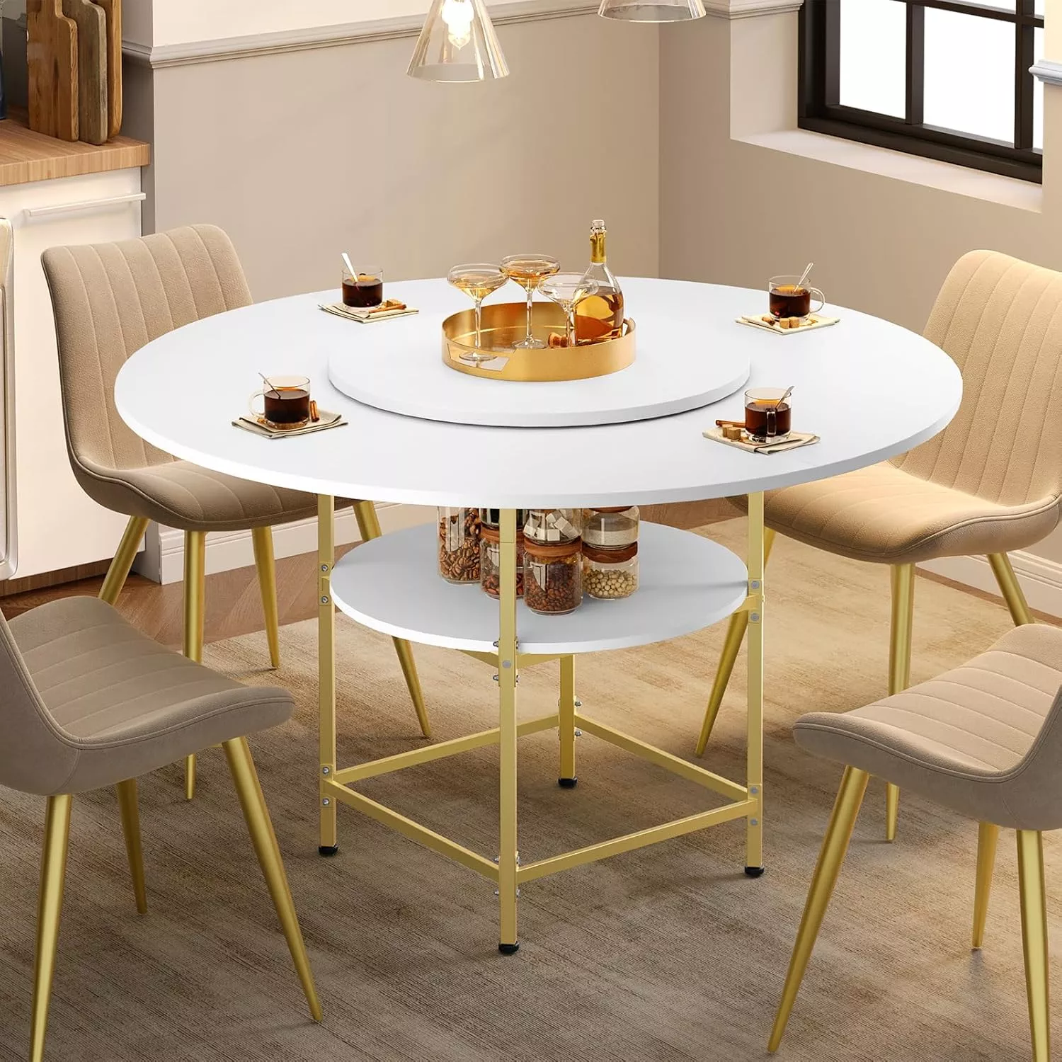 Gather around in style with this beautifully designed 47.2″ round dining table — the perfect centerpiece for any kitchen or dining space. With a spacious circular top, elegant gold metal legs, and a built-in rotatable turntable, this table makes every meal a special occasion. Whether you’re sharing a weekday dinner with family or hosting friends on the weekend, this table offers the perfect blend of comfort, function, and charm.