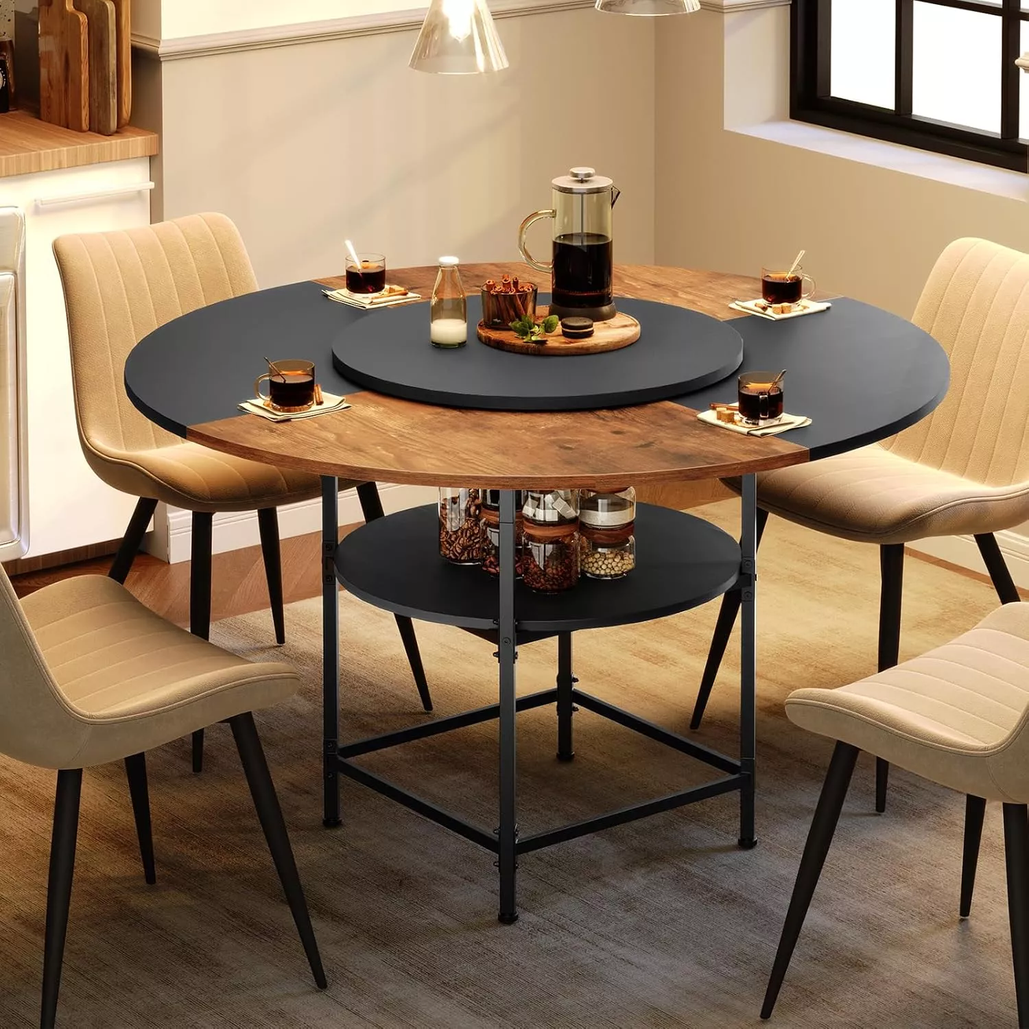 Measuring 47.2 inches in diameter and standing 30.5 inches tall, this round dining table comfortably seats four adults. A lower storage shelf tucked beneath the tabletop offers the perfect spot to keep dining essentials close at hand — napkins, placemats, or serving trays — all within easy reach.