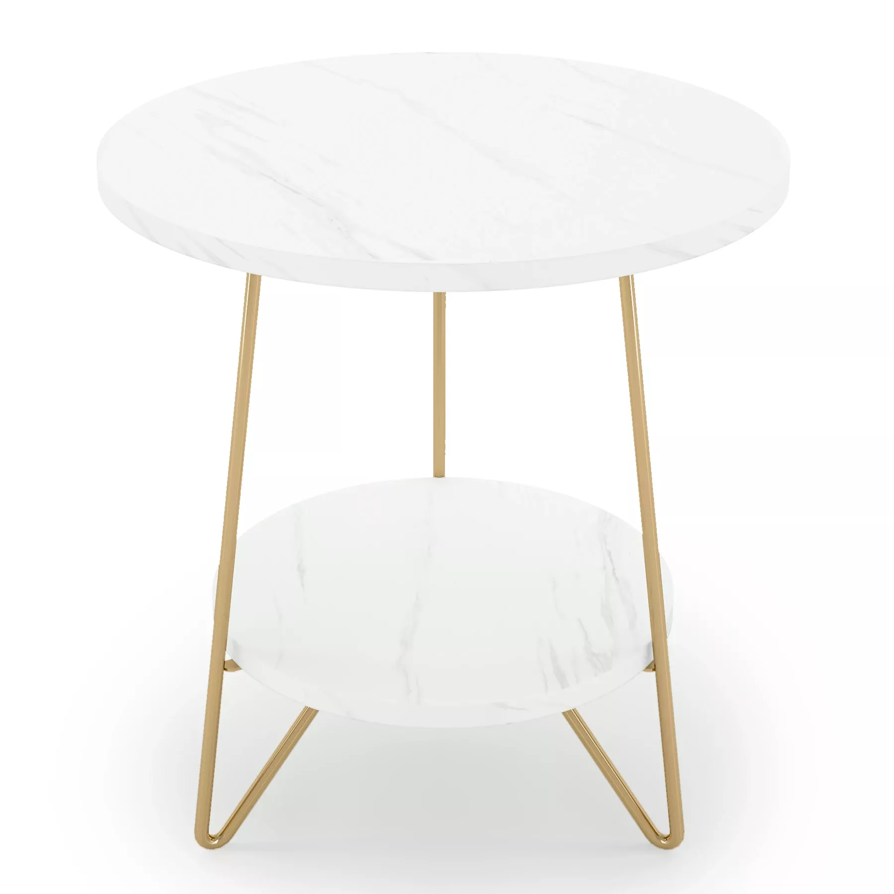 Bring a touch of luxury into your home with this round 2-tier marble end table—a stunning accent piece designed to elevate small spaces with style and function. Featuring a white faux marble top and elegant gold-tone hairpin legs, this side table creates a bold yet sophisticated statement. Its minimalist design blends effortlessly with modern, contemporary, or glam décor, while its space-saving size makes it perfect for apartments, bedrooms, and cozy corners.