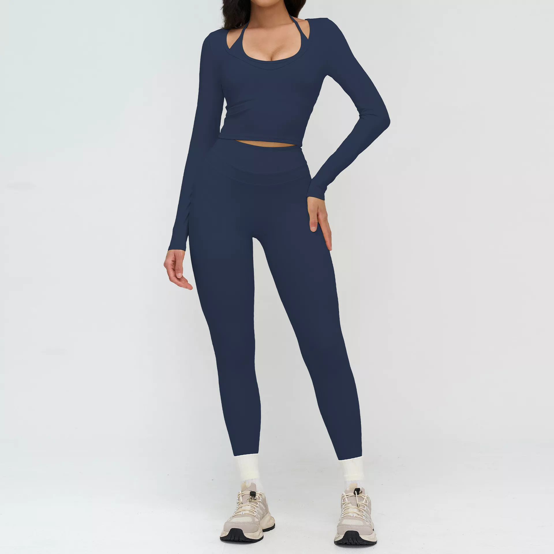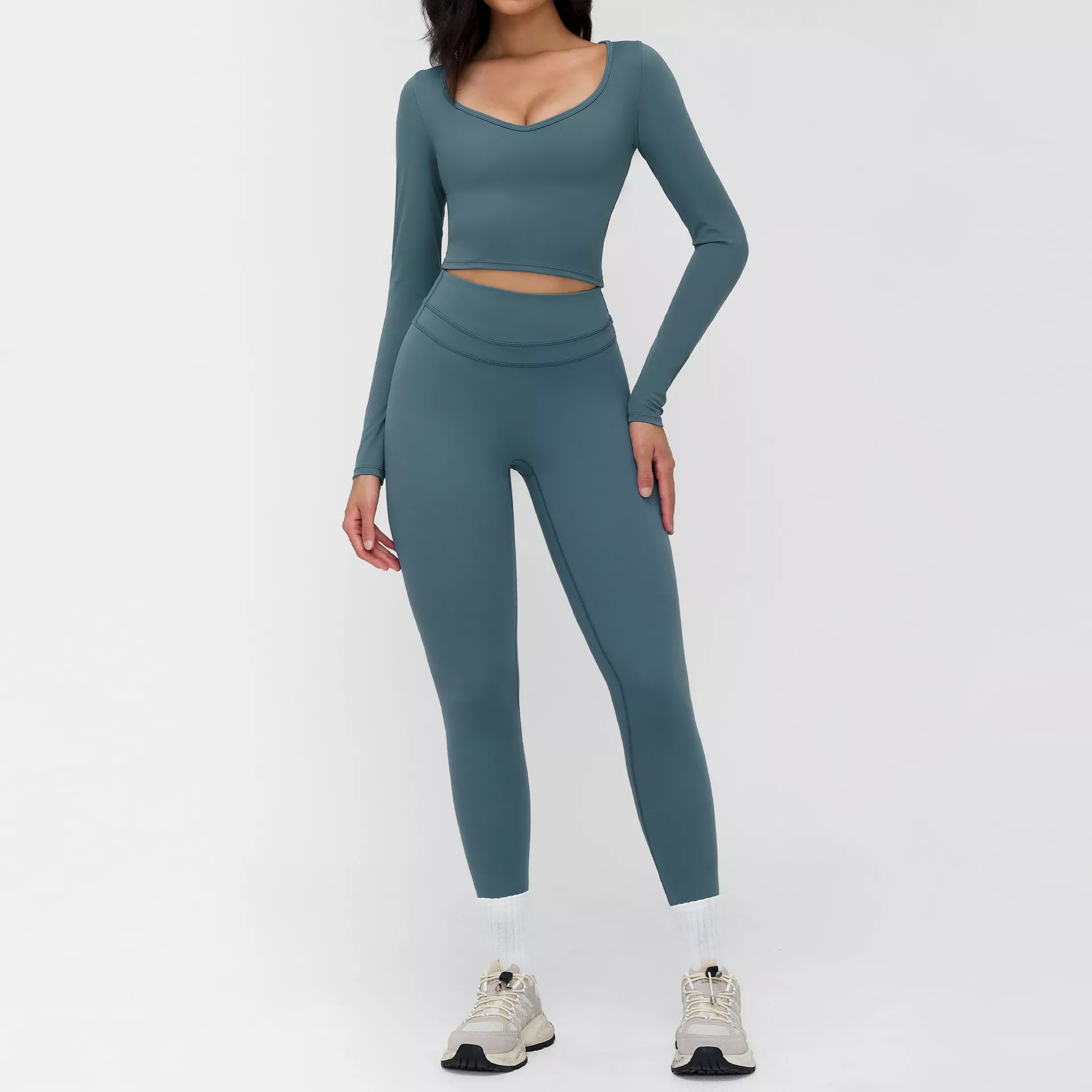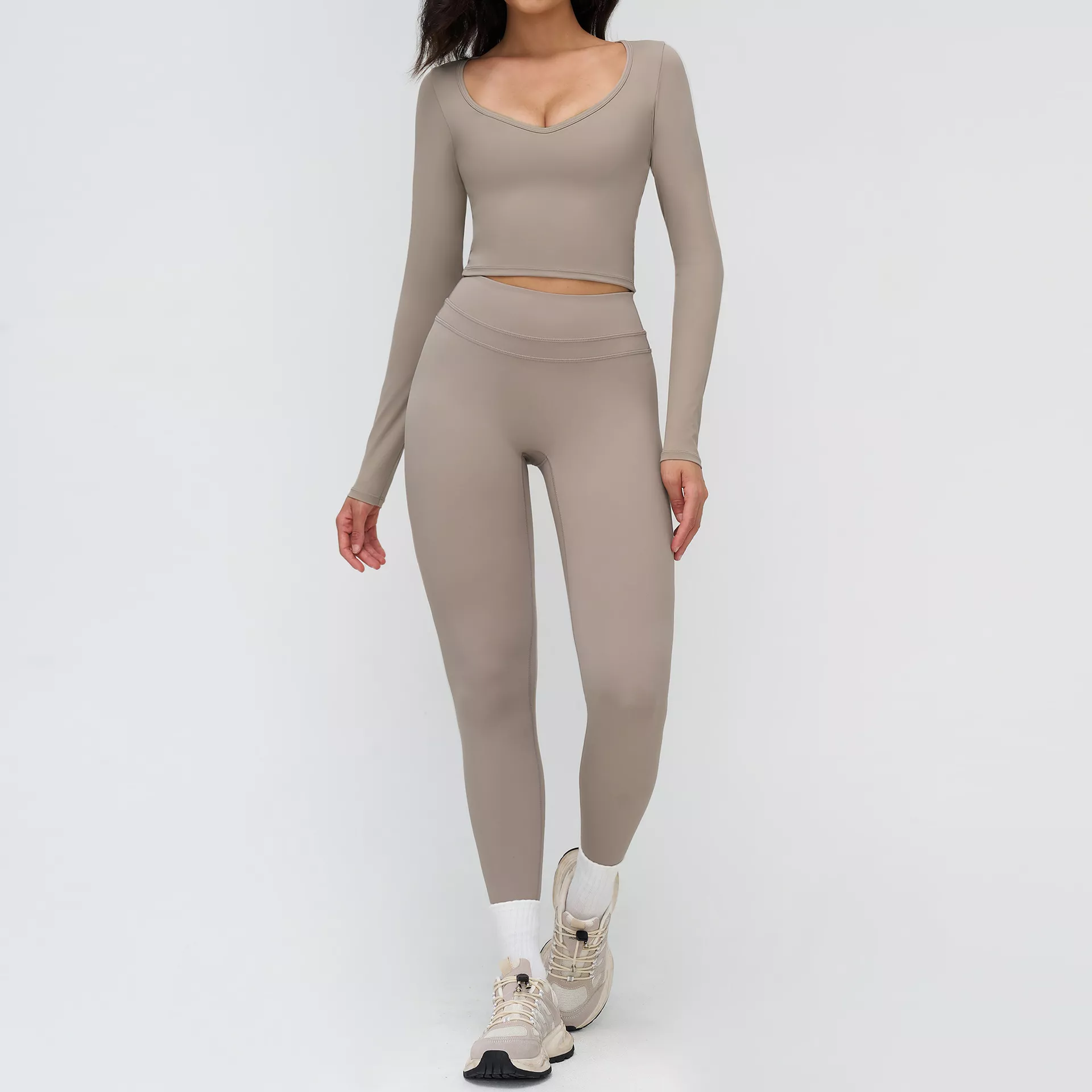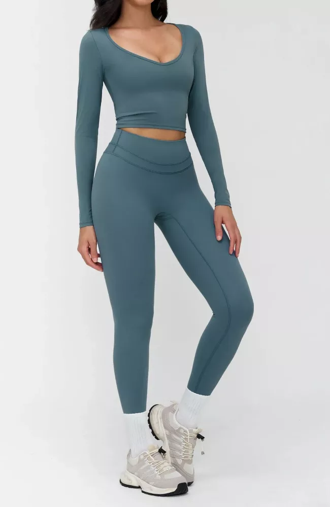 Made from a premium nylon and elastane blend, this workout set feels soft against the skin while delivering strong stretch and recovery. The fabric is breathable, quick-drying, and built to move with you. The long sleeve top provides light compression and reliable support, while the smooth, seamless feel helps reduce irritation during long training sessions.