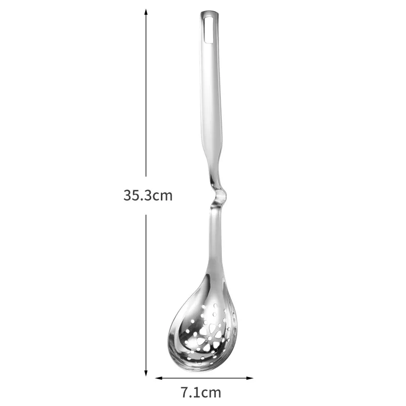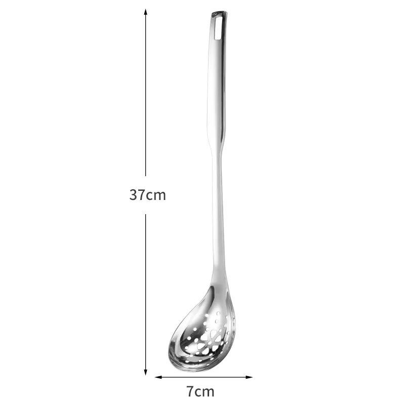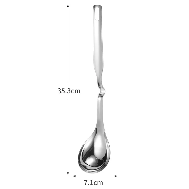 Crafted from high-grade stainless steel, this spoon is rust-resistant, durable, and built to last. The one-piece seamless design ensures no hidden dirt or residue, making cleaning effortless. Its deepened and enlarged spoon head allows you to scoop more food at once—perfect for family dinners or large servings. With a long, ergonomic handle, it keeps your hands safe from heat while ensuring a comfortable grip. The tail hanging hole lets you store it conveniently on kitchen hooks, keeping your space organized and accessible.