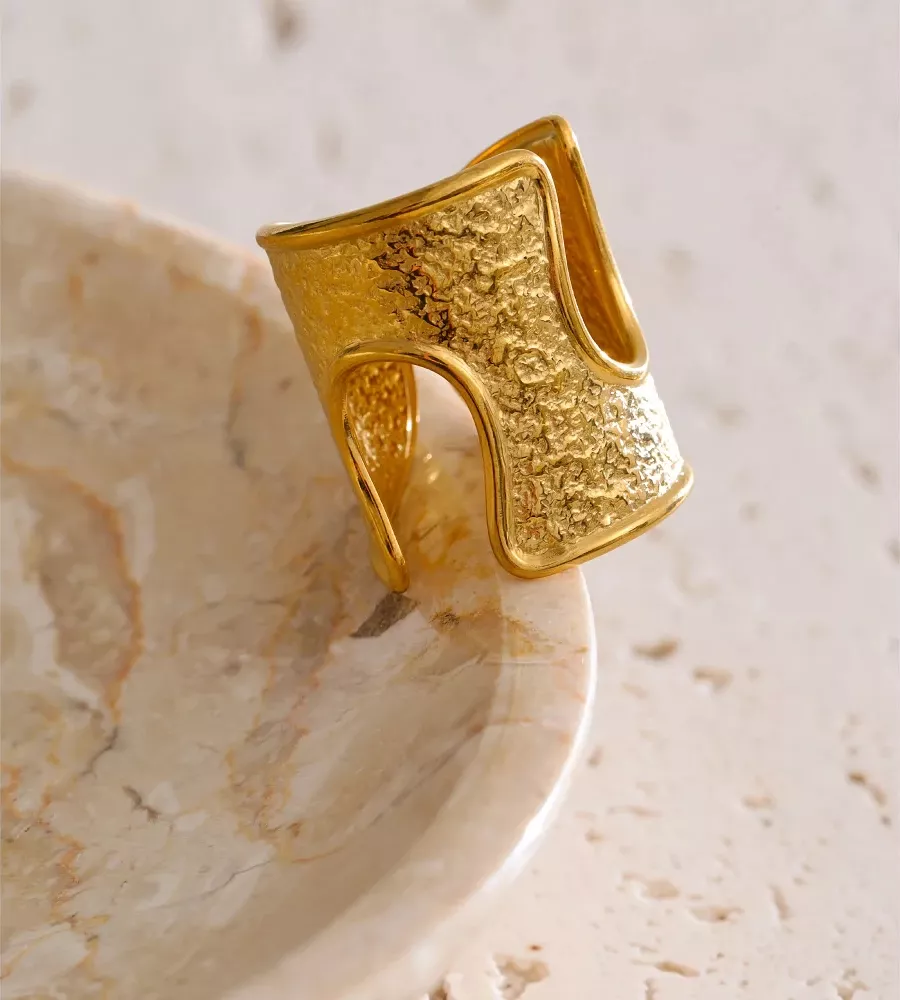 This gold tone open ring is designed for those who love effortless elegance with a bold, modern twist. Inspired by classic old-money aesthetics and updated with a contemporary geometric form, this ring brings refined confidence to any look. The hammered texture catches the light beautifully, creating depth and character that feels both artistic and luxurious. Its open, hollow design keeps it lightweight and comfortable, making it easy to wear all day without feeling heavy on your finger.