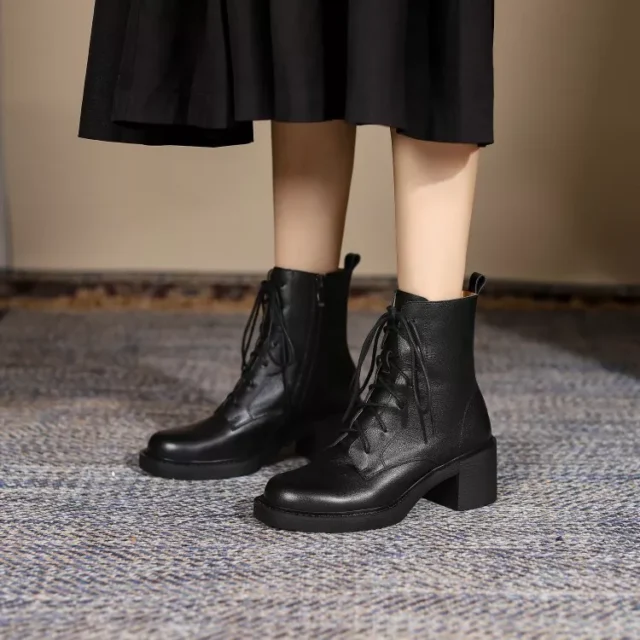 Elevate your winter wardrobe with these genuine leather ankle boots designed to blend retro charm with modern comfort. Crafted from premium cowhide leather, these boots feature a classic round toe and lace-up design that add an effortless touch of elegance to any outfit. The 6-inch high thick square heel and subtle platform provide height and stability, making them perfect for both daily wear and evenings out.