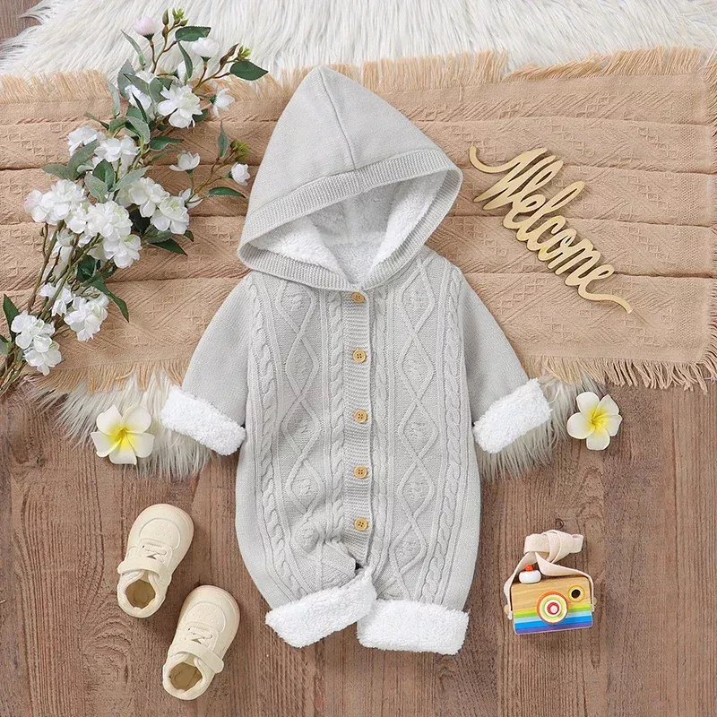 Winter Knit Baby Hooded Romper – Warm Fleece Infant Jumpsuit 0–18M