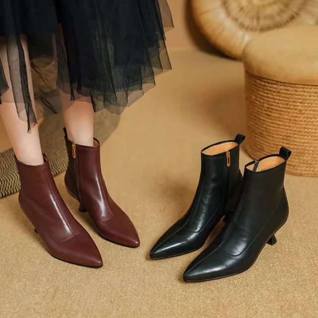Step into winter with confidence and grace in these Genuine Leather Short Boots for Women. Designed for modern elegance, these boots combine premium cow leather with a sleek pointed toe and a 2.1-inch (5.5 cm) thin heel for a refined look that’s both bold and feminine. Perfect for cold weather, they keep your feet warm, comfortable, and stylish all day long.