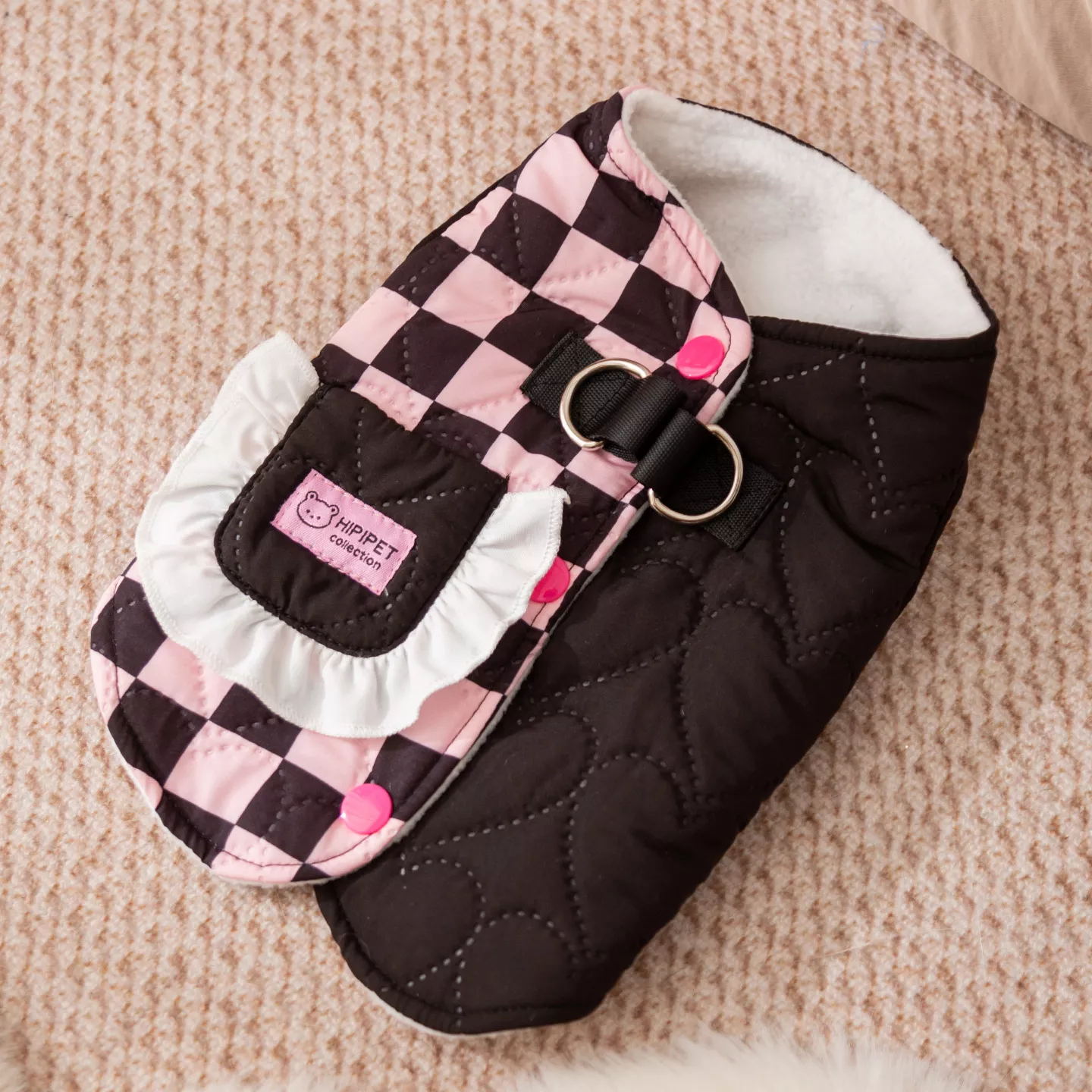 What makes this coat special is its balance of function and fashion. The plaid patchwork design stands out while remaining timeless, and the vest-style cut allows quick dressing with minimal fuss. It’s a practical choice for pets who don’t enjoy bulky clothing.