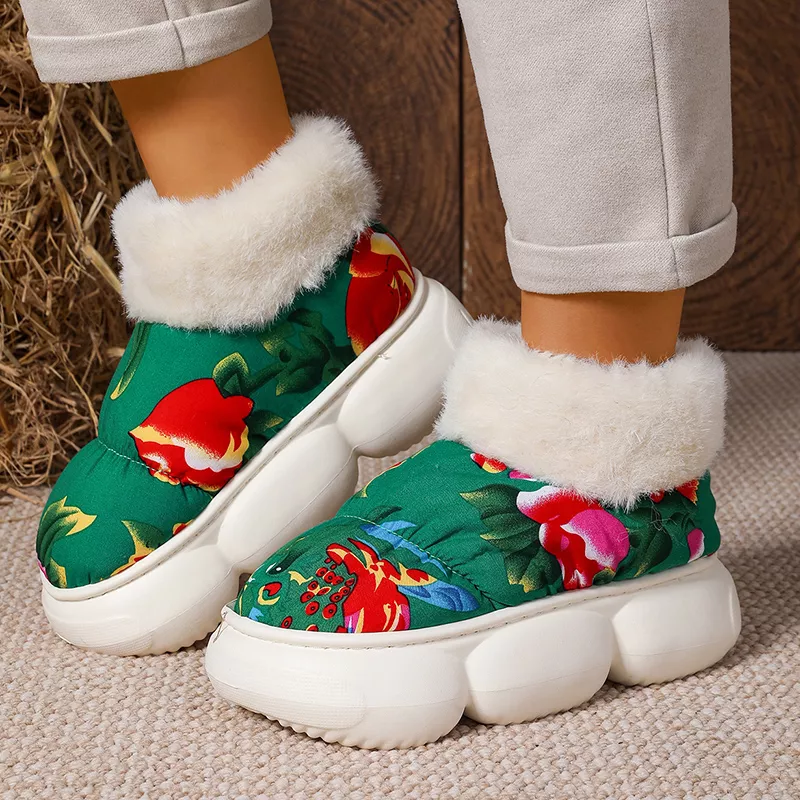 These boots feature a soft cotton upper combined with a plush interior that gently wraps your feet in warmth. The flat platform heel, measuring approximately 2.4 inches, adds height without sacrificing comfort. A durable rubber outsole delivers steady grip on slippery or uneven surfaces, making these boots ideal for outdoor walks, daily errands, or winter holidays.